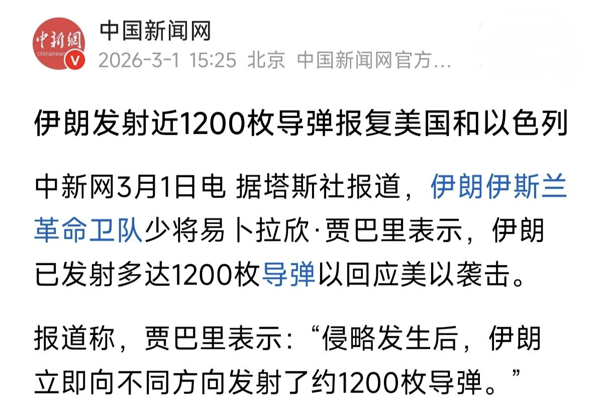 美国:开战12小时发动了900次空中打击! 伊朗:已经发射1200枚各型导弹! 美伊双方都公布了当前一个阶段的作战数据,美方称开战后的前12个小时发动了900次空中打击,伊朗方面则宣布已经发射了1200枚各型导弹,从目前的作战态势来看,伊朗显然是吃亏了,但并没有被美军和以色列军队彻底压制。 伊朗的反击力度非常高,各种导弹和无人机攻击了巴林、卡塔尔、科威特、约旦、阿联酋、沙特等国,只要有美军存在的周边国家都遭到了伊朗导弹攻击,伊朗的导弹也摧毁了大量美军目标。 接下来,就要考验作战双方的韧性,伊朗的导弹不可能如此高强度持续发射,美以的防空导弹也不可能无限拦截,目前双方的导弹消耗都非常快,尤其是美以的防空作战压力巨大,作战中甚至出现了三枚爱国者防空导弹拦截一枚伊朗导弹最终拦截失败的情况。 如果按照目前双方的导弹消耗计算,伊朗的中远程导弹已经打掉三分之一,美以也至少消耗了数千枚各型防空导弹,双方都很难持续高强度打下去。
