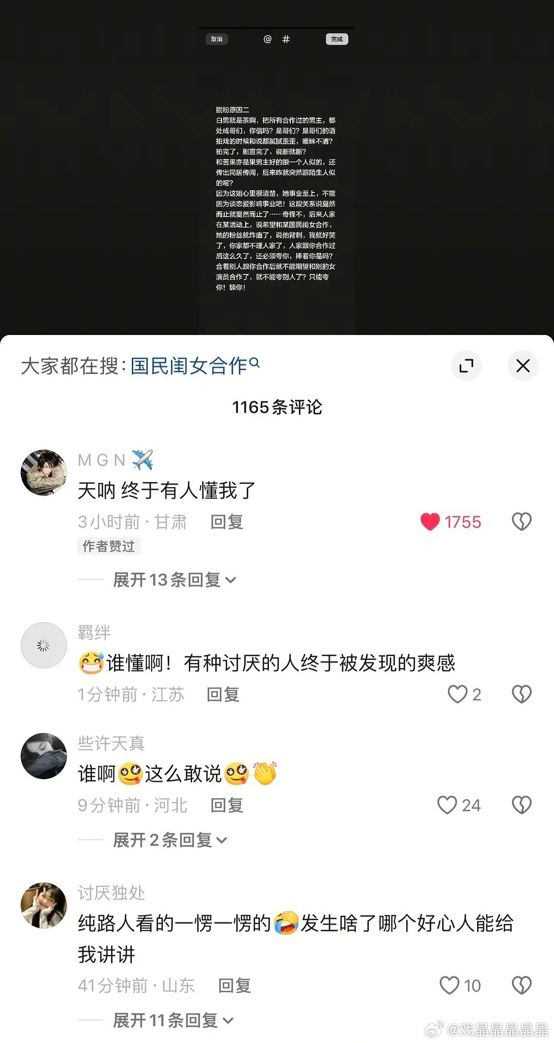 呃粉太会玩转粉圈了,在外面装林更新的粉丝夸老呃的演技、还说215是大男主剧