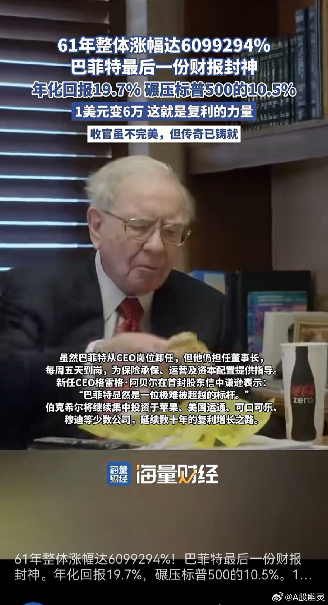 a股投资 巴菲特伯克希尔年报公布……61年收益近61000倍,是真牛逼啊年收益平均19.7%这就是复利的魔力!——就算年20%收益吧,这个收益率,我们绝大多数散户是看不上的,因为一年收益20%他们认为太低了!我们计算下,1.19^61约58000,1.2^61约68000。——其实,只要踏实一点,坚定信心,保持耐心,在正确的道路上,积少成多,集腋成裘,聚沙成塔,是早晚的事。