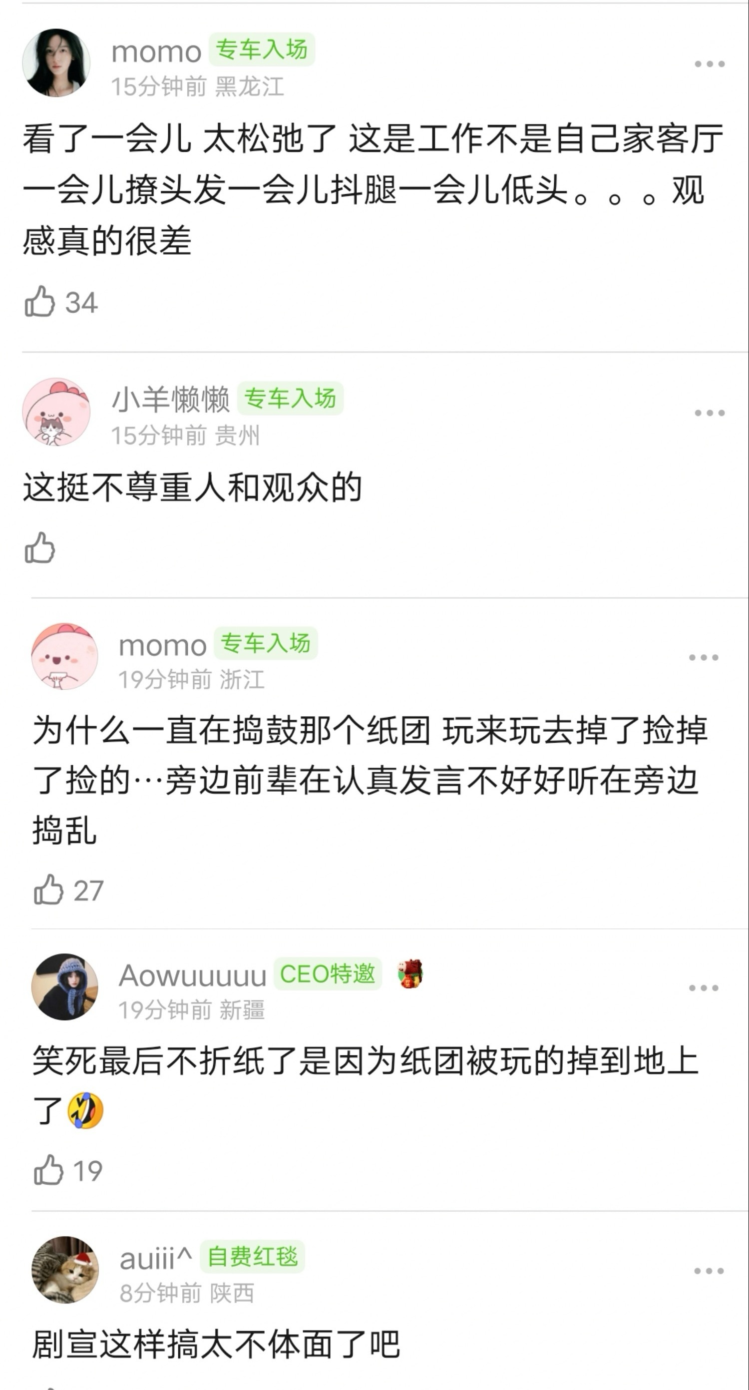 陈昊宇剧宣被热议了(她和梅婷双C位),网友发现陈昊宇参加《好好的时光》剧组直播的时候,几乎全程低头折纸,包括前辈讲话的时候,网友也指责她这种行为极其不体面。