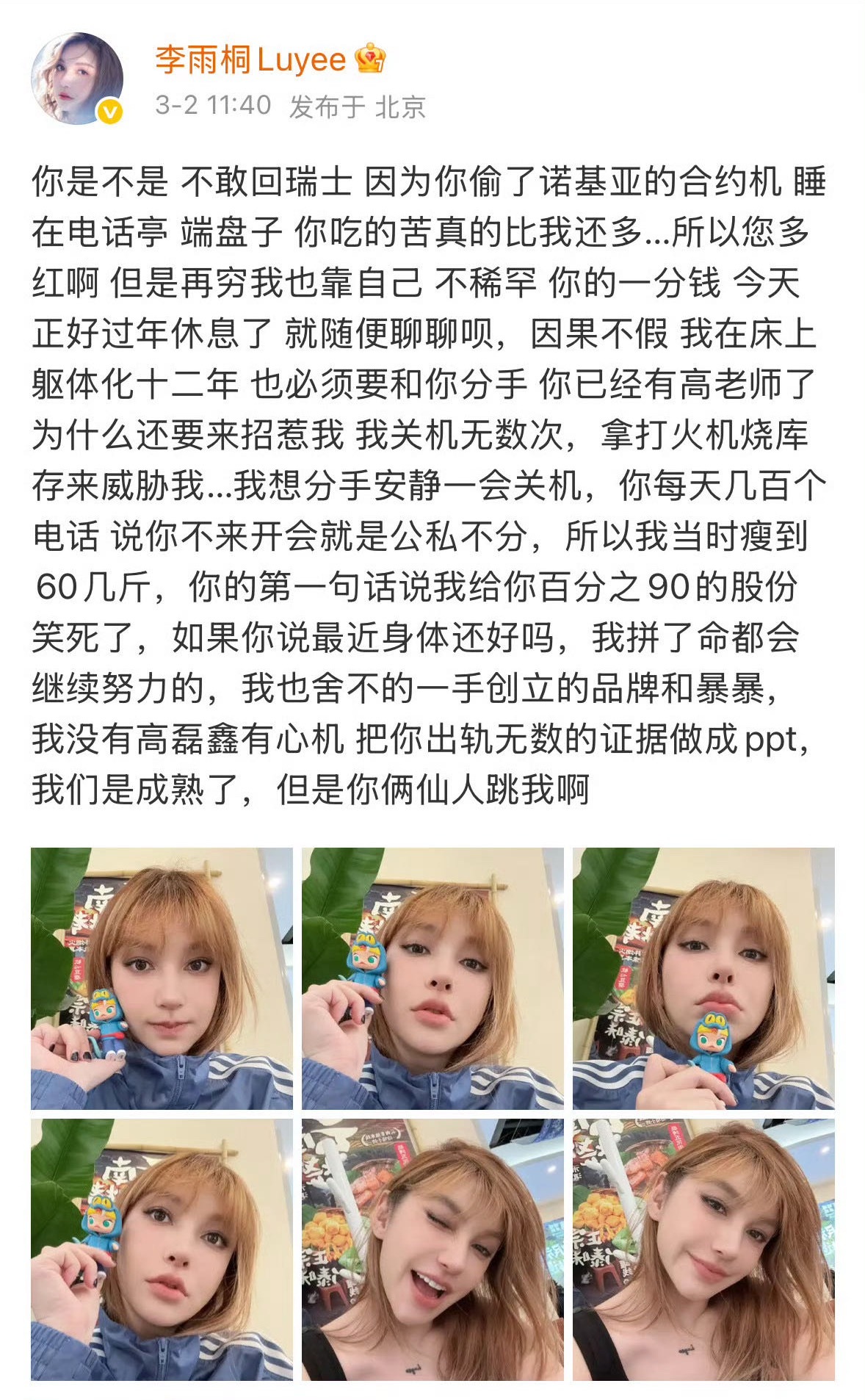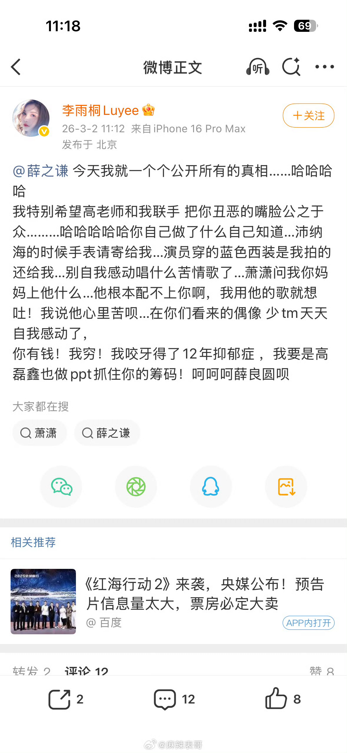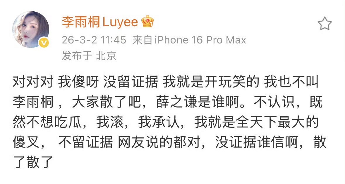 李雨桐疑似删博李 雨 桐 这 是 删 博 了 还 是 隐 藏 了,上 午 喊 话 薛 之 谦 的 博 文 全 部 不 见 了 ,只 发 了 一 条 新 的:
