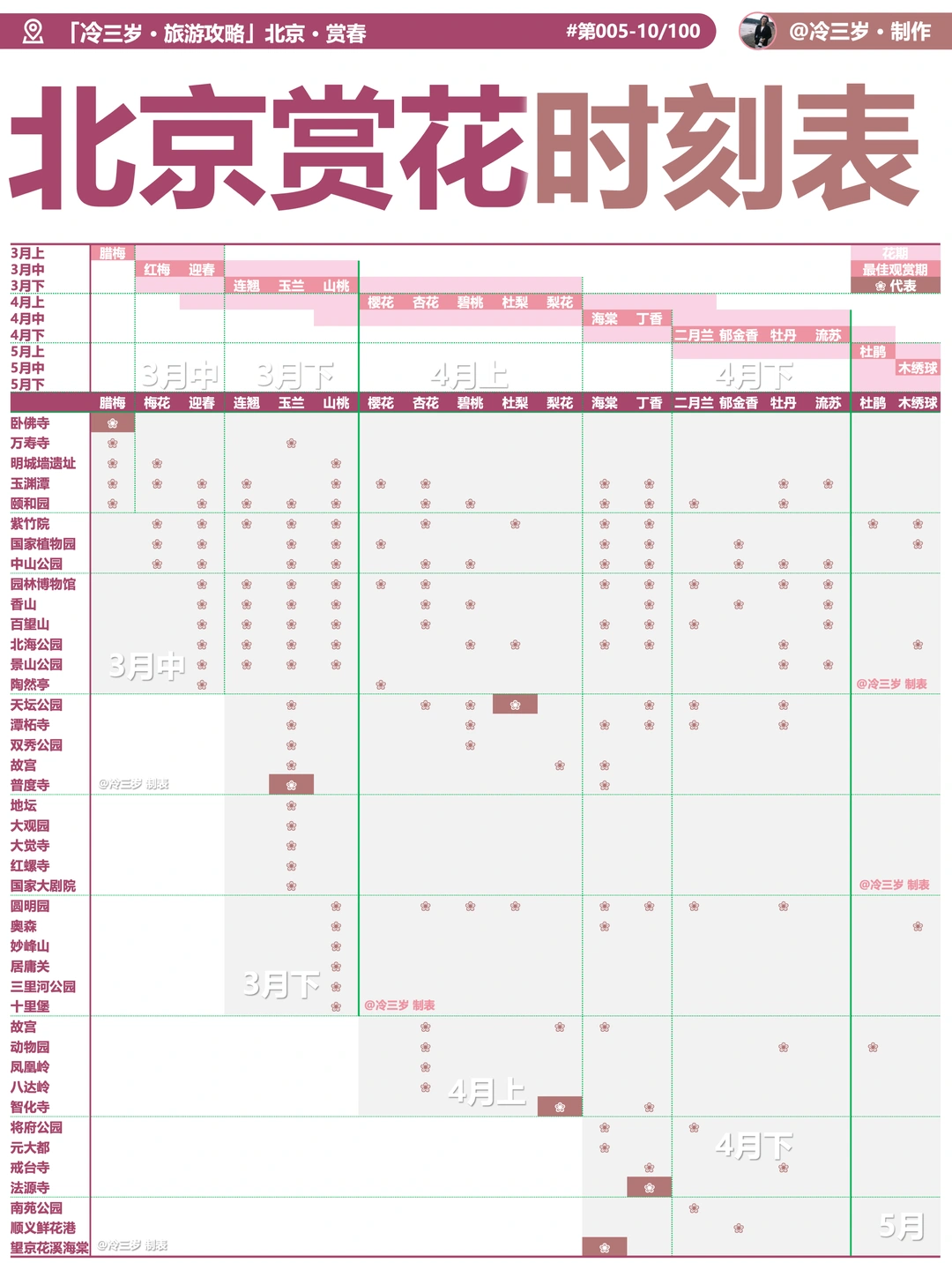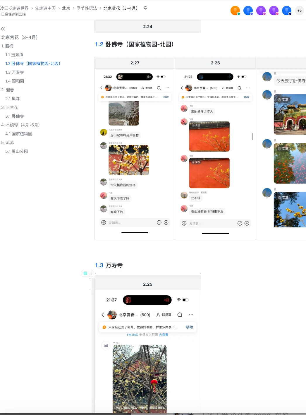 续赏秋之后 我开始做北京赏花跟踪了 图1的表,把之前的地图整理成表格了 方便查阅 有待优化地方:什么花,哪些地方最好看 这块还标注得不太准,不够全 目前只列了: 腊梅:看卧佛寺 玉兰:看普度寺 杜梨:看天坛 梨花:看智化寺 丁香:看法源寺 海棠:看望京花溪海棠 毕竟大部分人也只会挑几个去 PS.大家今年or去年 觉得哪些地方非常惊艳的 求分享吖 此外 还是之前的方式 1.我会继续整理文档,汇总花开情况 2.群里大家也会实时分享实况,如图2 3.信息,我还会持续刷新,并同步