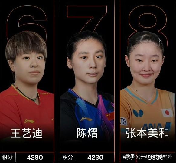陈熠最新排名上升到第七,新加坡大满贯收获满满。 陈熠现在和王艺迪只差50分,成功超越张本美和的排名。 新加坡大满贯陈熠身兼三项,4-0横扫陈幸同、3-0复仇桥本帆乃香,成功跻身女单四强。 都说陈熠昙花一现,从去年美国大满贯开始,先是击败孙颖莎、半决赛又战胜蒯曼,横滨冠军赛赢王曼昱、香港总决赛赢陈幸同、全运会赢奥运冠军陈梦,国乒女队主力当之无愧。 陈熠身高臂长,护台面积大,中远台相持能力很强,都说是“新版小王曼昱”。 陈熠提高大赛抗压能力,屏蔽了所有不好的声音,只用比赛成绩来证明自己。 相信陈熠假以时日,一定是国乒女队主力之一。 加油陈熠,用每一拍坚持,书写自己的乒乓辉煌。 图片来自网络侵权可删。