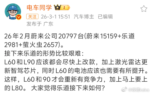 据博主爆料,蔚来卖了15159台,乐道卖了2981台,已经和萤火虫一桌了。