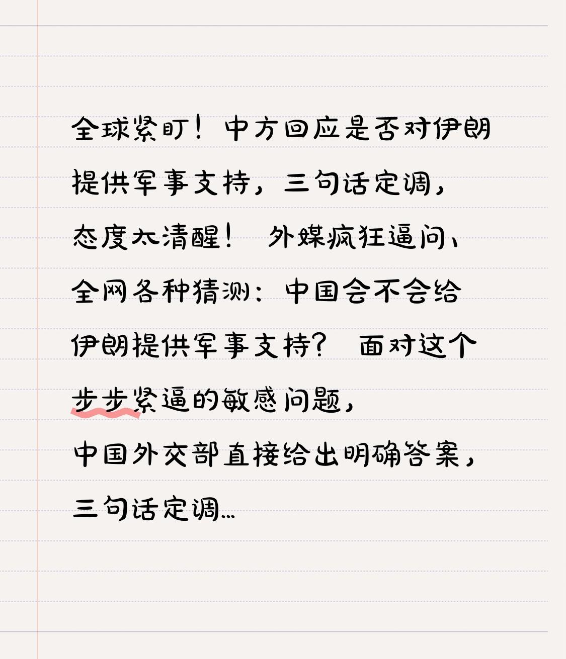 全球紧盯!中方回应是否对伊朗提供军事支持,三句话定调,态度太清醒! 外媒疯狂逼问、全网各种猜测:中国会不会给伊朗提供军事支持? 面对这个步步紧逼的敏感问题,中国外交部直接给出明确答案,三句话定调,不卑不亢,立场清晰到让所有人服气! 最近中东局势彻底炸锅,战火越烧越旺,霍尔木兹海峡紧张到极点。不少人被带节奏,要么喊着“直接出兵”,要么被西方造谣“中国已送武器”。大家都在等中国表态,一步走错,就可能被拖入战争漩涡。 但中方的回应,直接打破所有幻想与谣言!官方明确表态:中国坚持政治外交解决分歧,反对使用武力;支持伊朗维护主权与正当权益;愿劝和促谈、推动降温。 同时直接辟谣“中伊军购”假新闻,态度斩钉截铁:不军事介入、不提供进攻性武器、不结盟、不参战、不拱火递刀! 这不是软弱,而是顶级大国智慧。我们和伊朗是朋友,该帮的一定会帮:外交上主持公道,经济上稳定合作,安全上护好同胞,但绝不为了热度盲目参战。战争没有赢家,一旦军事介入,受苦的只有平民,只会让局势彻底失控。 不被情绪绑架,不被外媒带偏,守底线、讲原则、重和平,这才是真正负责任的大国担当。我们不惹事,也绝不怕事,捍卫国家利益寸步不让,但更珍惜来之不易的和平环境。 世界越乱,越显中国清醒。愿战火早日熄灭,愿对话取代对抗,也为祖国的理性、定力与底气点赞!