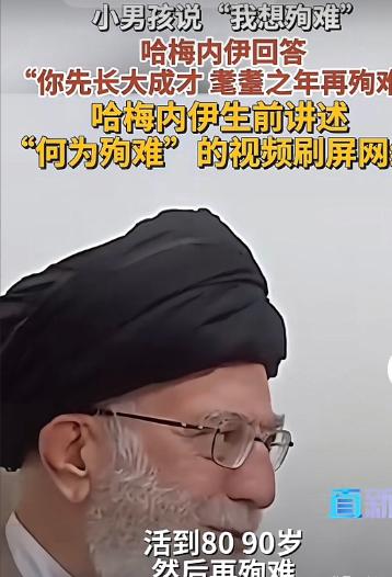 唏嘘不已,刚看到哈梅内伊遇袭的消息,一位曾驻伊朗的老记者低声叹道:他的人生结局,竟在几十年前就被自己亲口预言。 那时,一个稚嫩的小男孩跑到他面前,仰头说:“我想殉难。”哈梅内伊略一沉思,蹲下身摸着孩子的头,清晰地说:“你先长大,长高,好好学习,成为科学家,为伊斯兰做贡献。要活到80、90岁,然后再殉难。”说完,他笑着亲了孩子的脸颊。这段旧视频如今被翻出,每个字都像刻下的宿命——就在近日的轰炸中,86岁的哈梅内伊以身殉国,年龄恰恰落在他叮嘱的“80、90”之间。他不仅这样教导一个孩子,更用生命一丝不苟地践行。那一句“活到高龄再牺牲”,不是敷衍,而是他早已埋下的伏笔,如今在导弹声中轰然应验。 现在一想到那个小男孩或许早已成年,而哈梅内伊用最壮烈的方式圆满当年的诺言,就觉得命运仿佛一场精心安排的闭环。你们身边,也有这种“一语成谶”的真实瞬间吗?