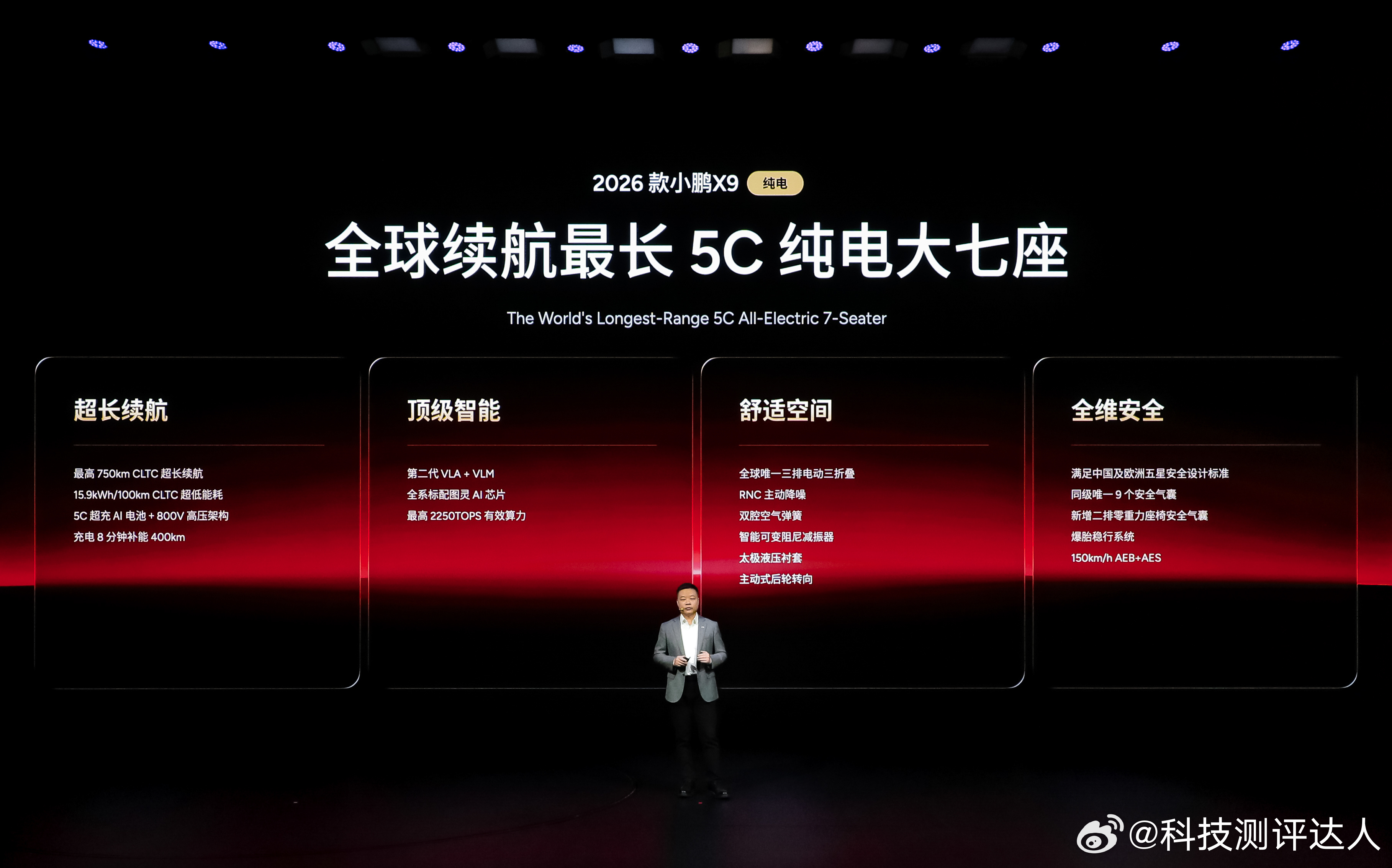当新能源MPV市场越来越拥挤,能真正脱颖而出的,永远是技术和体验双在线的产品。小鹏智驾负责人表示,真正拉开差距的时刻已经到来,这句话放在新款小鹏X9纯电版身上,一点都不夸张。新款X9纯电版30.98万起正式上市,产品力全面对齐增程版,真正做到一车双能、同标旗舰。作为全球续航最长的5C纯电大七座MPV,它最高CLTC纯电续航750km,电耗低至15.9kWh/100km,再加上800V+5C超充,10%-80%补能只要11.7分钟,家用、长途都足够安心。空间和舒适同样在线,全球首发三排电动折叠、带气囊的零重力座椅、百万级太极AI底盘,再配上全车9安全气囊、中欧双五星安全标准,把家庭出行的需求都考虑到位。智能层面,全系标配图灵AI芯片,搭载第二代VLA物理世界大模型,朝着L4级智驾稳步迈进,第二代VLA也将在3月开始全量推送,后续还会实现驾舱融合与Robotaxi运营。目前X9已经拿下1月新能源MPV销量冠军,累计交付突破5万台,成为不少家庭的首选。现在购车还有最高5万元权益、定金膨胀、专属置换补贴,诚意给得很足。现在大家买车越来越理性,不再轻易被噱头和营销打动,而是更看重真实力、真体验、真安全。小鹏X9之所以能在激烈的市场里脱颖而出,就是因为它把家用MPV该有的责任感做到了极致,照顾到车上每一位乘客,无论是老人还是孩子,都能感受到舒适与安心。一台真正为家庭而生的车,自然会收获市场的认可,这也是中国品牌越来越强大的最好证明。小鹏智驾负责人称拉开差距的时刻到了新款小鹏X9纯电版上市30.98万起