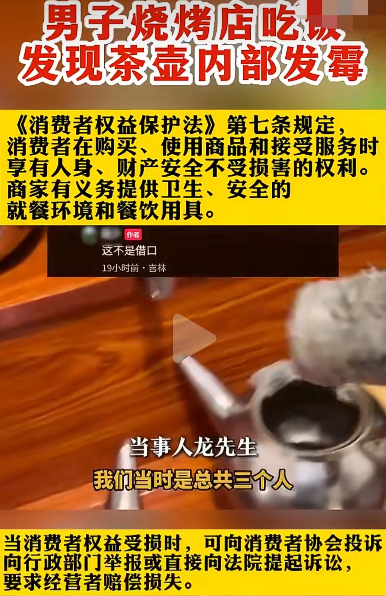 吉林通化一男子和朋友去吃烧烤,刚喝了店里的茶水没多久,肚子就开始不舒服。他拿起茶壶仔细一看,当场就愣住了——壶里全是黑乎乎的霉斑,有的地方都长毛了,看着又脏又恶心。 男子越想越害怕,这哪里是喝茶,简直是喝带霉菌的水。 他去找店家要说法,对方就一句“老板在韩国打工”,直接把责任推得干干净净,连句道歉都没有。男子没办法只能去投诉,可到现在也没个结果。 一个茶壶脏成这样,店里平时卫生能好到哪去。茶具潮湿就爱发霉,不彻底消毒,不仅闹肚子,还可能有致癌物。 老板在哪都不是理由,更不能拿来推卸责任。 咱们在外边吃饭,干净卫生比啥都强。这种连最基本的清洁都做不到的店,真没必要惯着。食品安全从来都不是小事,可别等真吃出毛病了,才想着后悔。饭店里的饮食安全吗? 食品安全 茶壶发霉