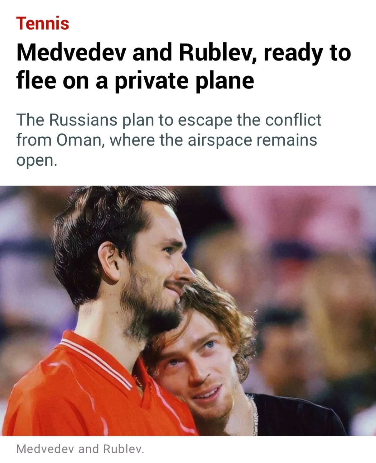 来自西班牙《马卡报》的消息,被困在迪拜的梅德韦杰夫和卢布列夫已经设计出了一份“出逃”计划,他们想乘车离开阿联酋前往阿曼,然后乘坐当地时间周二凌晨的私人飞机离开战争冲突区,最终的目的地可能是土耳其或者亚美尼亚。如果这个计划能够顺利执行的话,梅总和卢布将能如期赶上本周中开赛的印第安维尔斯大师赛。