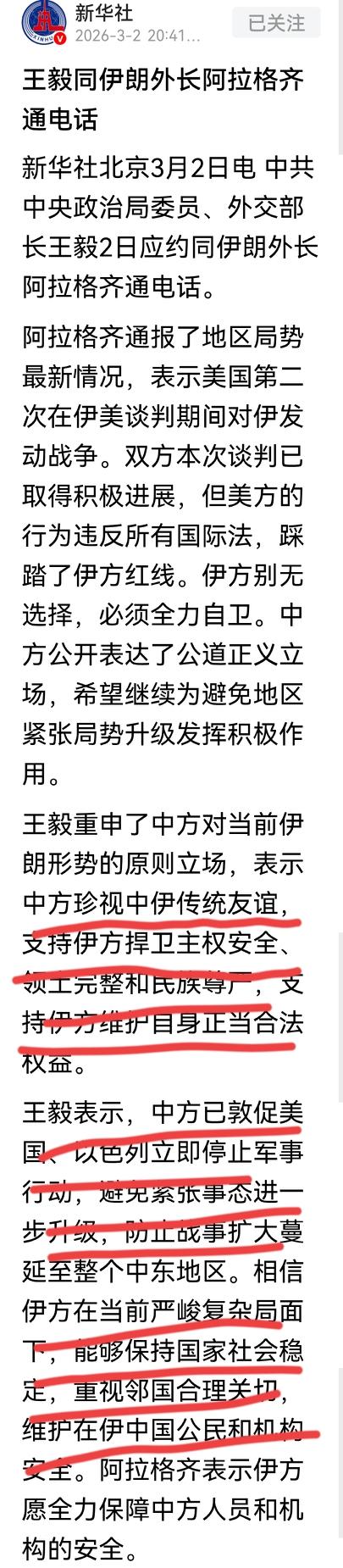 中国与伊朗通话了,中国说了这样几句话,并给伊朗提了个醒。 中国说中方珍惜与伊朗的传统友谊,中国支持伊朗捍卫主权、领土完整及民族尊严,支持伊朗维护自身的正当合法权益。 中国还说中国已经敦促美以立即停止军事行动,避免地区紧张局势升级。 中国还说希望伊朗在复杂严峻的形势下,保持好国家的稳定。 关于伊朗与邻国的关系,中国还特意提醒伊朗,希望伊朗考虑到邻国利益的合理关切,这看似简单的一句话其实就是给伊朗补了一个大聪明,提醒伊朗在还击战中,协调好与邻国的关系,这对伊朗很重要,会让伊朗得到邻国的理解与支持,更有利于伊朗捍卫国家的主权与领土完整,这就是大智慧! 中国的话意味深长,估计伊朗已经全部听懂了!