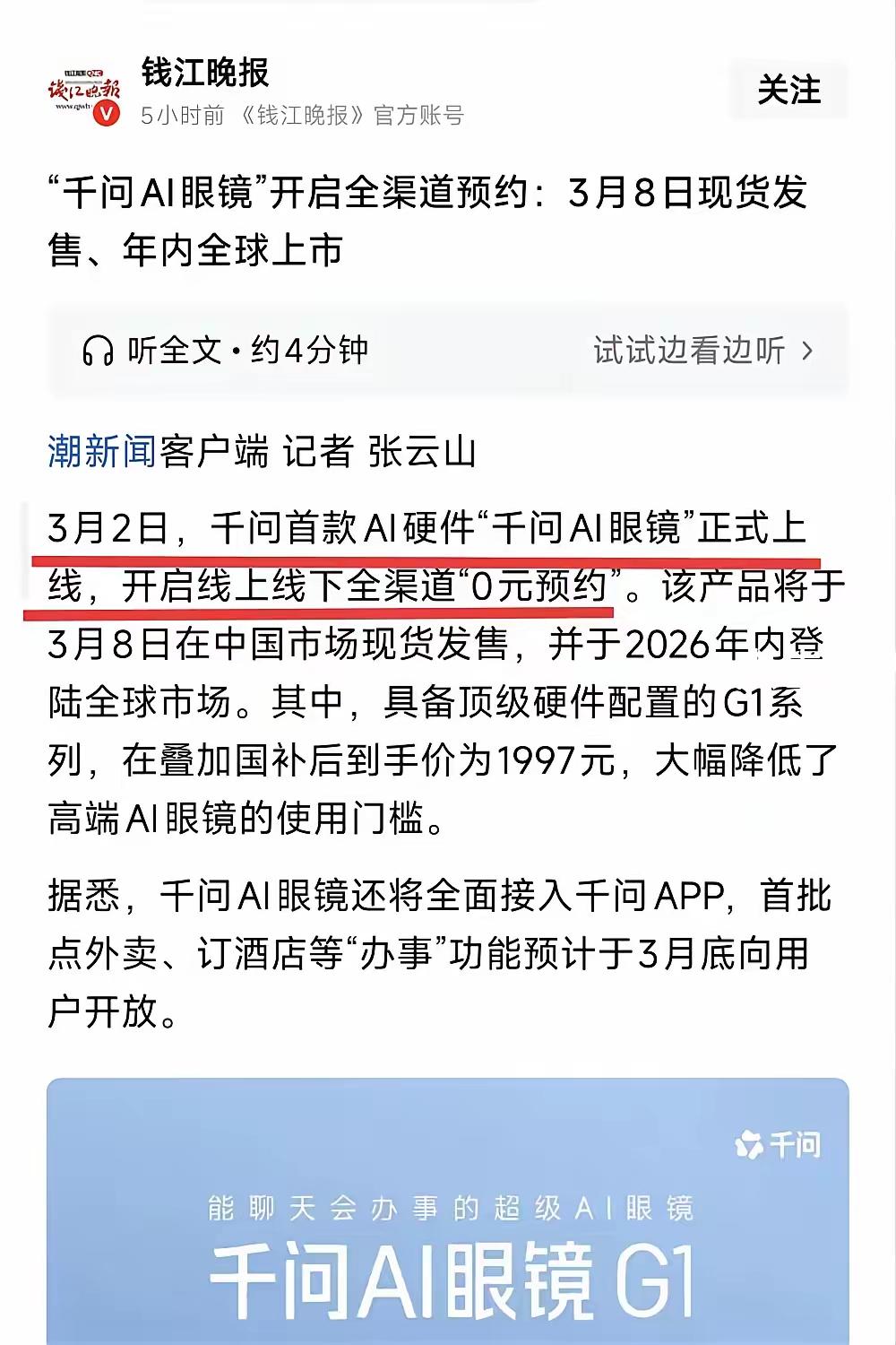 海外传来一条消息,国内还没有传开,但国外已经炸锅了! 正在巴塞罗那举行的MWC大会上,中国科技成为了老外们关注的焦点。尤其是千问首款AI硬件“千问AI眼镜”的亮相,让AI硬件赛道彻底沸腾了,同时也给了Meta、谷歌等国外巨头一点小小的震撼。 说实话,看习惯了中国低调发力,千问这次在 MWC大会 的操作,直接让人眼前一亮。谁能想到,千问居然把 AI 眼镜全球首秀的展位,摆在Meta正对面。这或许是巧合,但有一点毋庸置疑的是,中国AI眼镜已经拥有与全球巨头正面交锋的底气。 千问AI眼镜整机重量控制在40克左右,佩戴感受与普通眼镜几乎没有区别,长时间佩戴不会产生明显负担,彻底解决传统智能眼镜笨重不适的行业痛点。 产品搭载双旗舰芯片与独立AI大模型,支持五麦克风阵列与骨传导传音,在嘈杂环境下依然可以精准识别语音指令,交互响应速度达到行业顶尖水平。 眼镜具备0.6秒极速抓拍与3K视频录制能力,搭配行业首创的暗光增强技术,在夜晚与室内弱光环境下也能拍出清晰稳定的画面。 千问AI眼镜支持实时多语种互译功能,翻译准确率超过99%,出国旅游、商务交流不用再依赖手机,真正实现无障碍跨国沟通。 这款AI眼镜内置64GB存储空间,综合续航可达9小时,同时支持磁吸换电,用户可以随时随地快速补能,满足全天高强度使用需求。 国补后首发价格仅1997元,不到海外同类产品售价的三分之一,用亲民价格把高端AI可穿戴设备带入大众消费市场,打破巨头价格垄断。 展会现场海外观众排起长队体验产品,不少科技媒体记者连续驻足体验,镜头与文字记录下中国AI硬件带来的全新交互体验。 Meta、谷歌等企业高管专程来到千问展台参观体验,现场表情严肃,他们意识到中国品牌已经从跟随者转变为赛道竞争者。 MWC大会有超过350家中国企业参展,覆盖通信、终端、算力、AI等全产业链,中国科技军团以集体姿态站上全球顶级科技舞台。 中国AI产业已经完成从大模型到终端硬件的全链条布局,软硬件深度协同,场景全面落地,形成海外品牌难以复制的生态优势。 西方科技企业长期占据智能硬件高端市场,依靠专利与定价权收割全球用户,中国产品的出现让全球消费者拥有更公平的选择空间。 千问AI眼镜不仅是一款消费电子产品,更是中国AI技术走向世界的标志性载体,代表中国创新从本土走向全球。 海外社交平台相关话题播放量短时间突破亿次,海外网友纷纷留言称赞产品设计与功能,期待能够早日在本国市场买到。 中国科技企业不再满足于代工与模仿,坚持走自主研发、原创设计道路,用实力撕掉廉价标签,打造全球认可的高端品牌。 科技自立自强不是一句口号,而是无数科研人员日夜攻关的成果。每一款惊艳全球的产品背后,都是中国创新能力的真实展现。 麻烦看官老爷们右上角点击一下“关注”,既方便您进行讨论和分享,又能给您带来不一样的参与感,感谢您的支持!AI千问 中国AI新突破 ai线下峰会 ai海外增长 千问产品发布会 AI科技参访 各位读者你们怎么看?欢迎在评论区讨论。