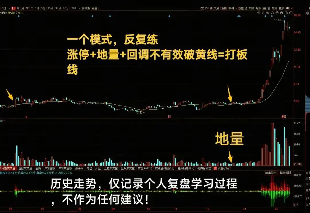 “涨停+地量+不破黄线” 的高胜率打板模式: 1. 涨停:主力资金进场信号。 2. 地量:回调抛压枯竭,筹码锁定好。 3. 不破黄线(常为20日均线):支撑强,主力未出货。 三者共振 → 主力洗盘结束 → 主升浪启动 → 放量突破回调高点即入场。 风控要点: - 止损:放量跌破黄线立刻离场。 - 止盈:涨幅达标或出现高位放量滞涨及时获利了结。 核心思想: 简单模式反复执行,形成纪律,避免情绪干扰,才能稳定盈利。