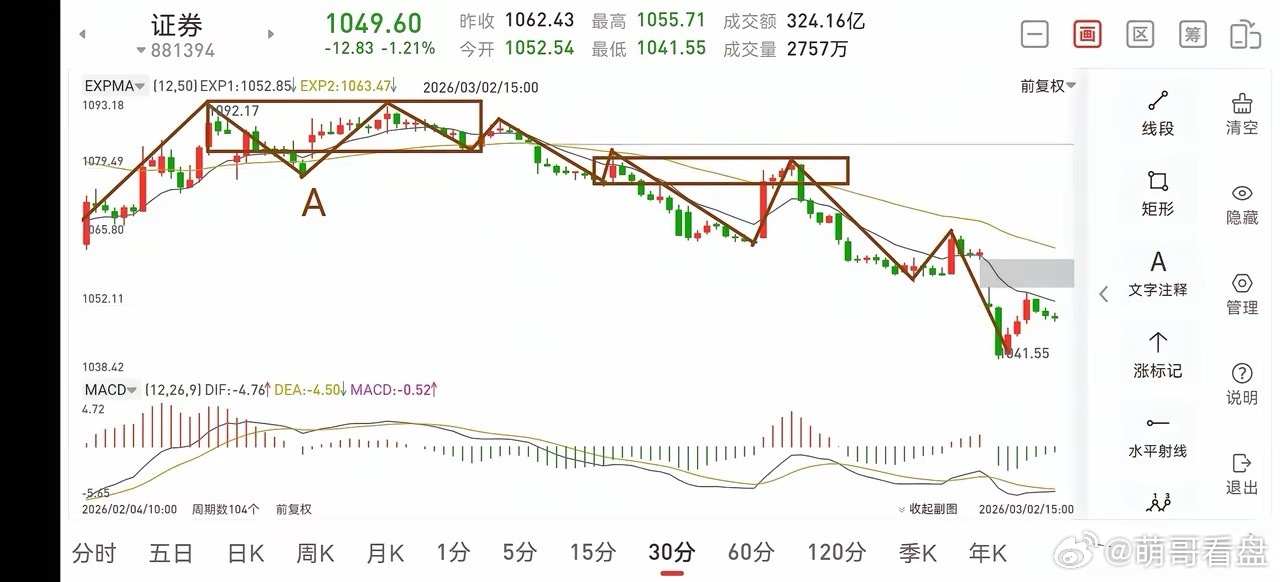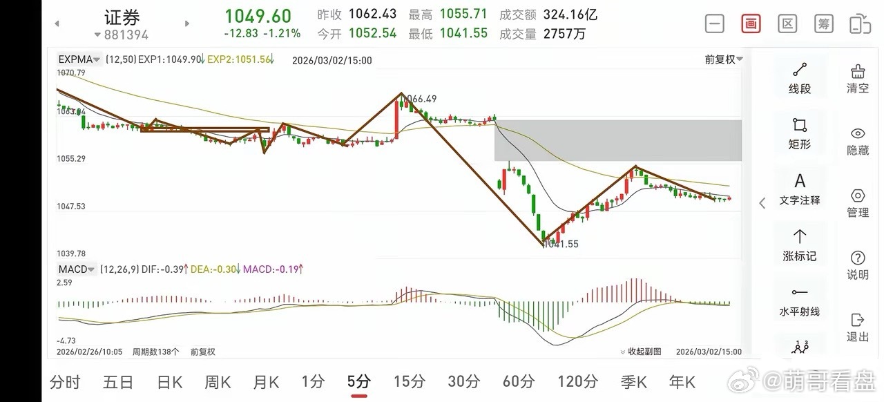 证券板块复盘(2026.3.2)今天下午证券板块走势还算可以,它的回调很弱,这也意味着明天是有短线操作机会的,但日线一笔调整还没有结束,所以明天只看反弹,反弹过后后面还是有可能再破新低的,当然这是后面几天的事了,操作上做好应对就可以了。1.从30分钟图一上看,明天会反弹30分钟一笔,大概率会回补上方缺口,从而构建第三个30分钟中枢,由第三个中枢逐步演化从构建日线三卖的过程,当然这个过程非一日就能完成的,如果你想在此处做高抛低吸,需要按5分钟级别去应对。2.从5分钟图二上看,下午的一笔回踩很弱,那么明天大概率会向上反弹去回补上方缺口,待缺口回补完成后,还会向下回踩30分钟一笔,所以明天你想做差价,开盘即可考虑回补三成仓位,待缺口回补完成后,再把三成仓位退出来,在做差价时,不要去追求极限操作,只要产生差价,就要考虑退出的问题了。因为还在日线一笔的回调中,还是有比较大的可能后面还会再破新低的。总之,日线一笔调整并没有结束,耐心等吧!