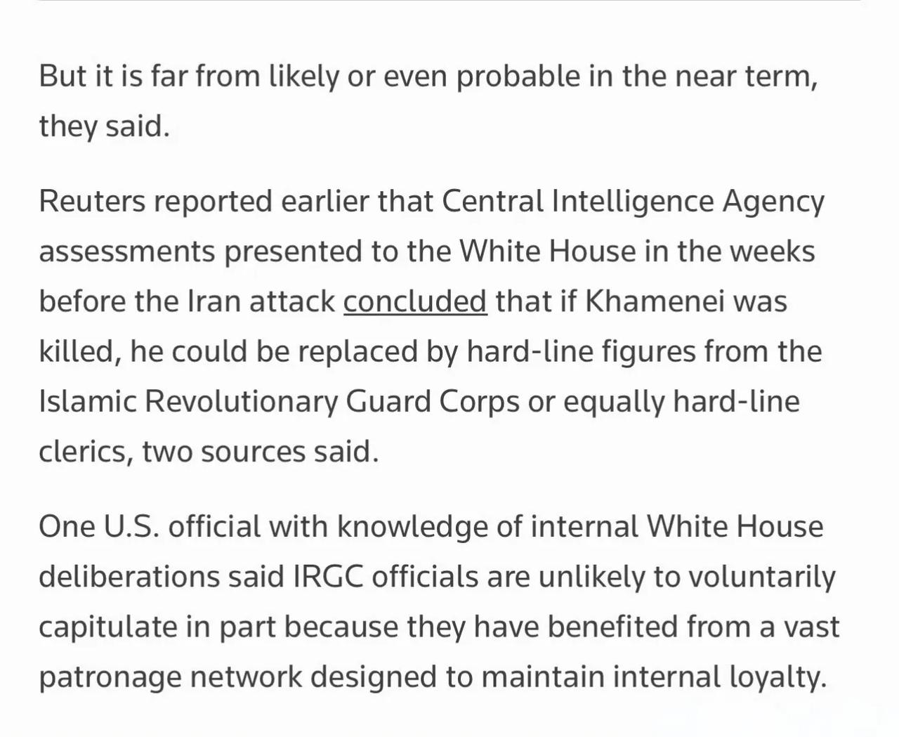 英国路透社报道称,美国情报部门和政府官员对于伊朗伊斯兰革命卫队成员主动投降已经越来越不抱希望,认为这种希望“非常渺茫”。 美以估计是之前听了太多伊朗带路党提供的消息,认为伊朗就是个摇摇欲坠的破茅屋,只要上前踹一脚就会倒塌。兔子急了还咬人呢,更何况伊朗。美以根本就没有去想一个有着上千年底蕴的民族被逼到绝境会是什么样,这三天的伊朗表现的就是豁出去了,而且伊朗内部还很团结,没有出现美以期盼的内乱。 这样的情况如果持续下去,美以就要坐蜡了。