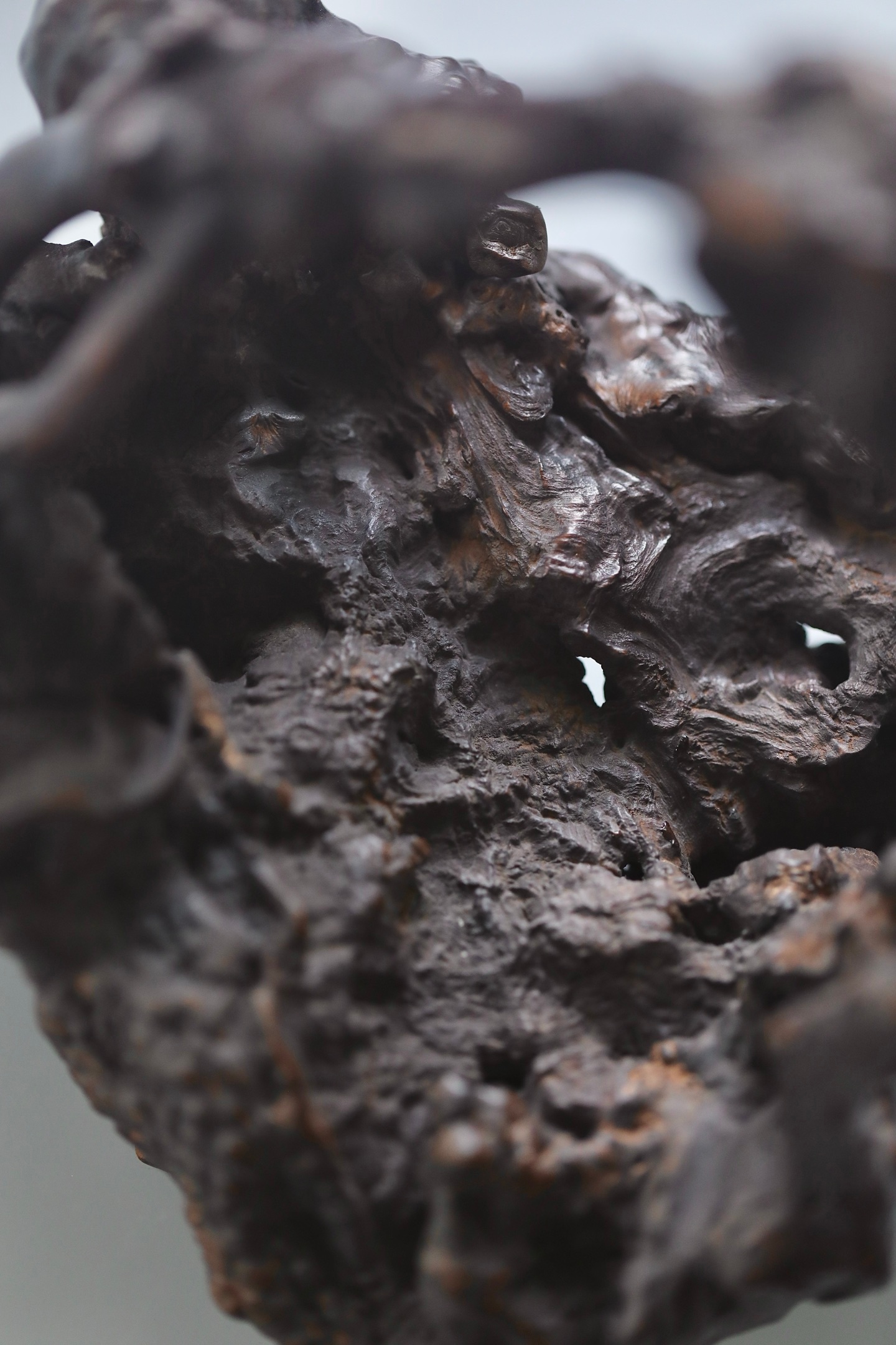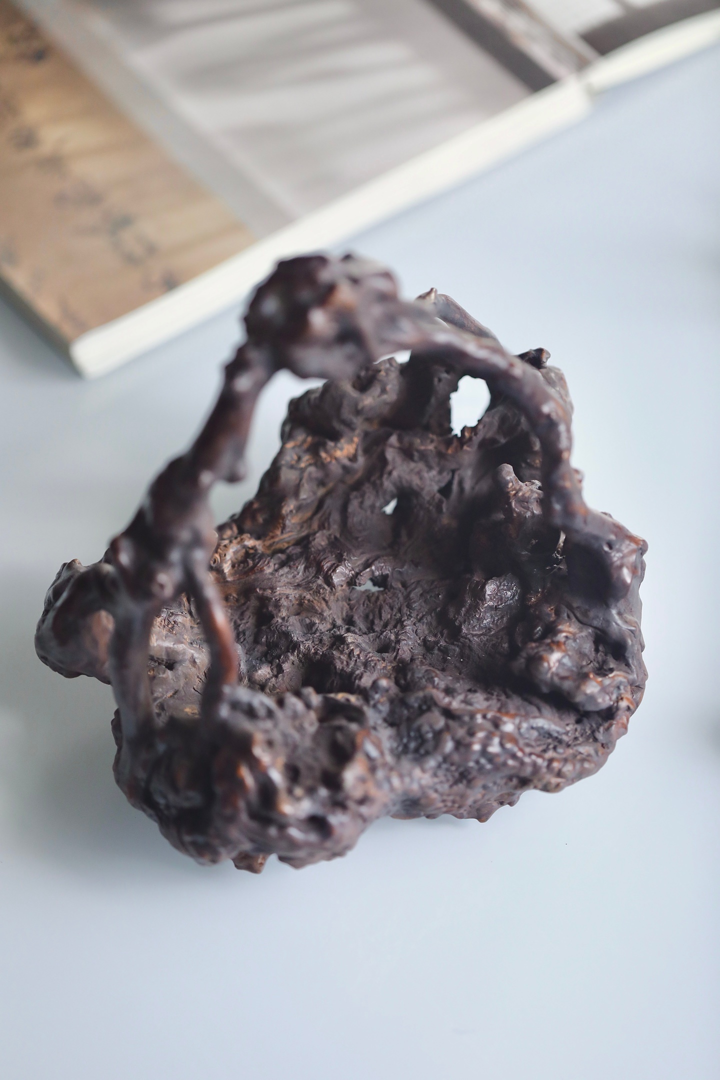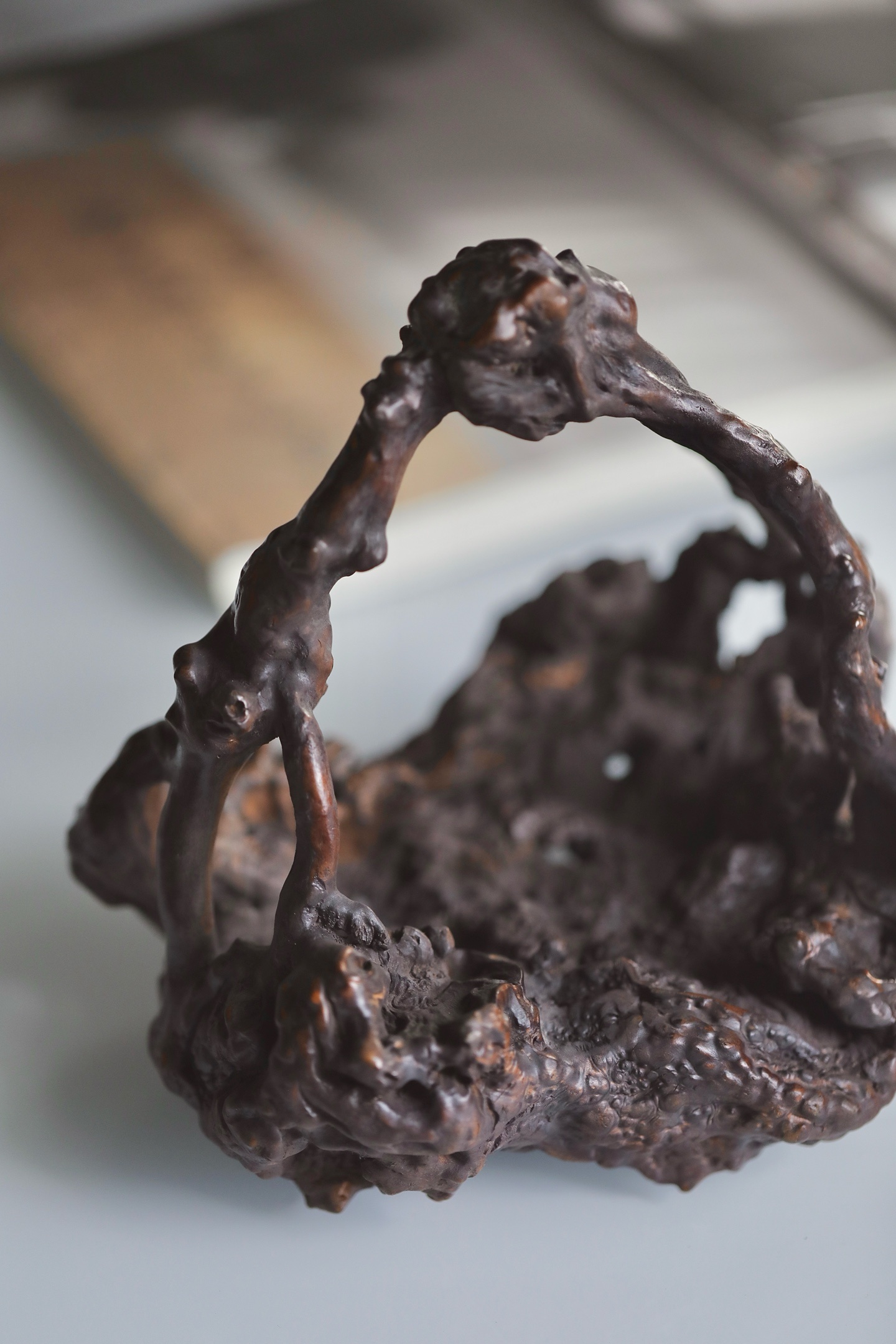 整体造型苍古嶙峋,表面沟壑纵横,如历经岁月洗礼的古松老干,尽显“枯木逢春”的禅意美学。提梁与器身浑然一体,线条曲折灵动。器表经精细打磨,温润沉稳,包浆初见雏形。置于案头,可作花器、可盛雅玩,是文人书房中不可或缺的点睛之重器。