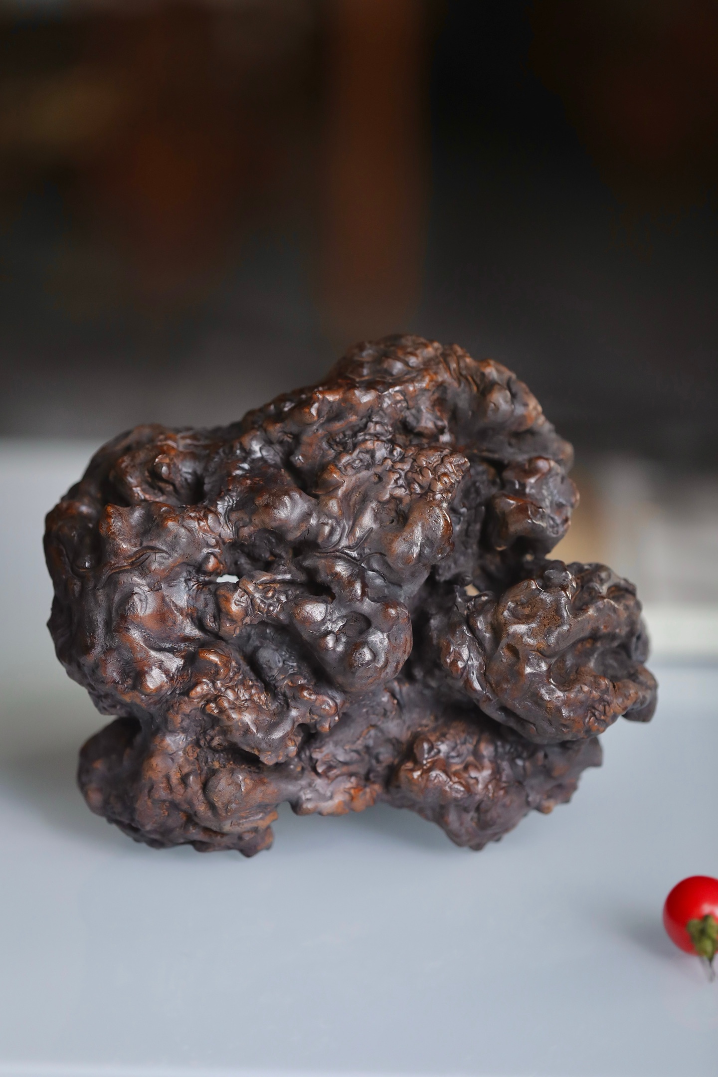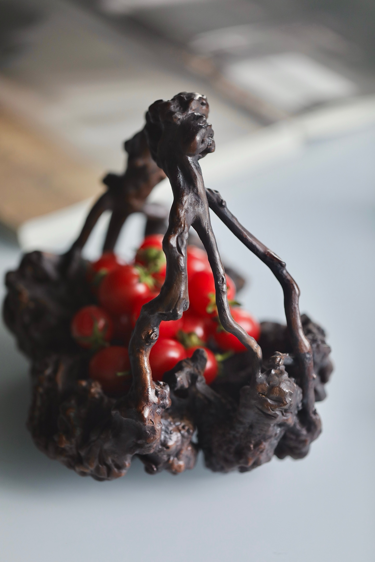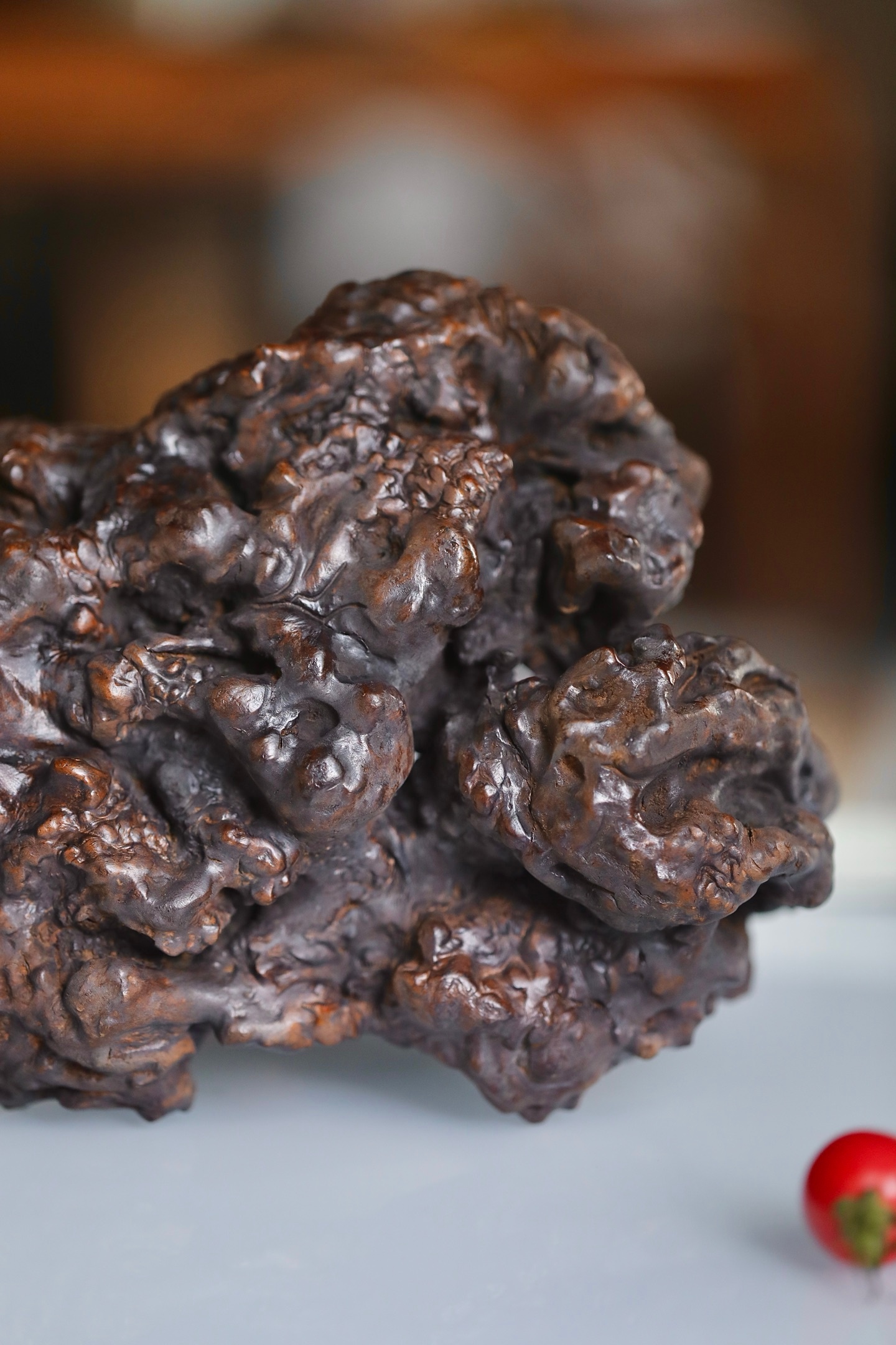 整体造型苍古嶙峋,表面沟壑纵横,如历经岁月洗礼的古松老干,尽显“枯木逢春”的禅意美学。提梁与器身浑然一体,线条曲折灵动。器表经精细打磨,温润沉稳,包浆初见雏形。置于案头,可作花器、可盛雅玩,是文人书房中不可或缺的点睛之重器。