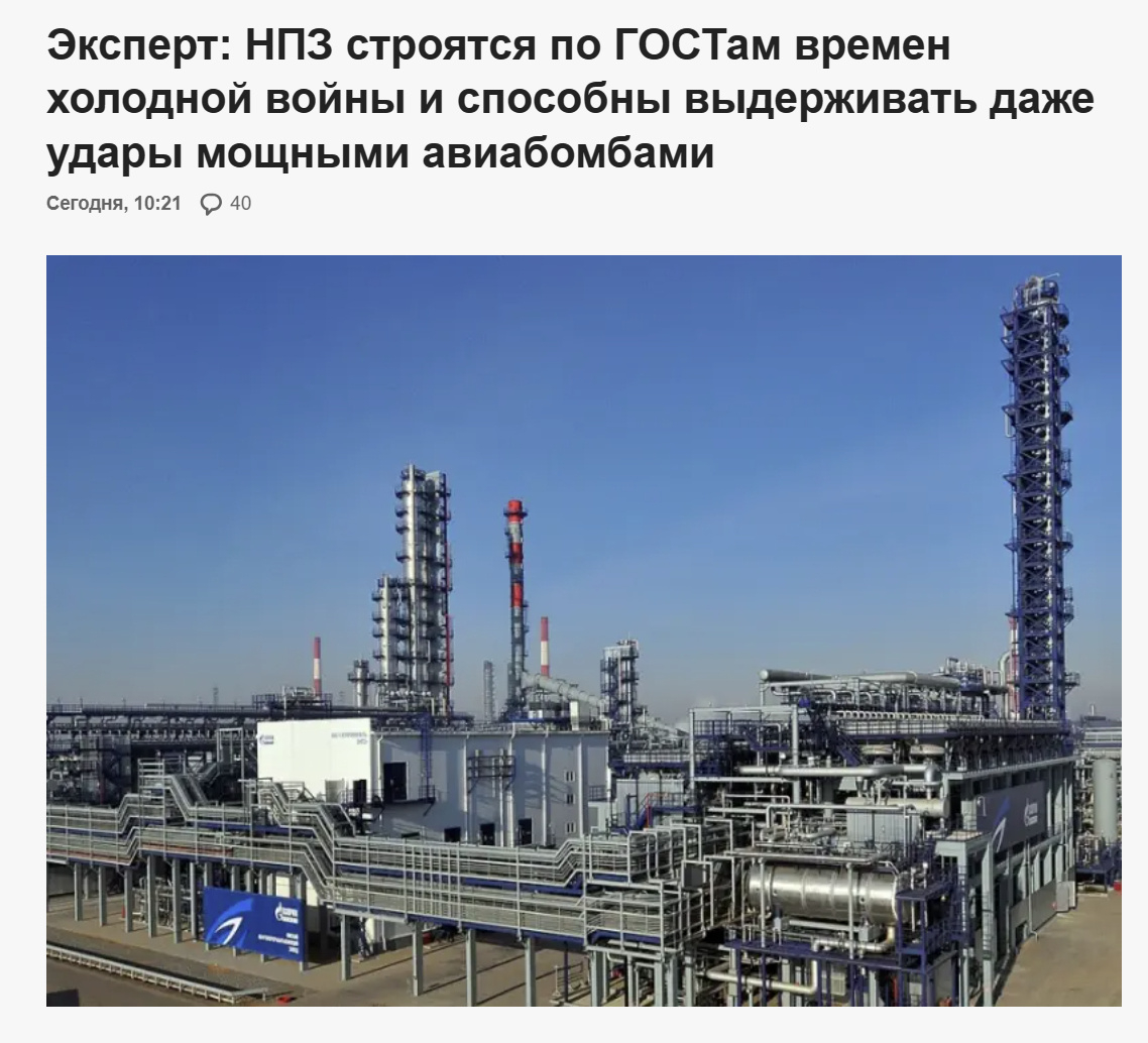 俄罗斯炼油厂的建造和现代化标准是“以冷战时期采用的国家标准”为基础的,旨在“确保炼油厂即使在遭受1000公斤航空炸弹袭击的情况下也能生存下去”。在此基础上,几公斤的无人机袭击可能导致炼油厂起火,但无论如何也不会导致工厂被毁。