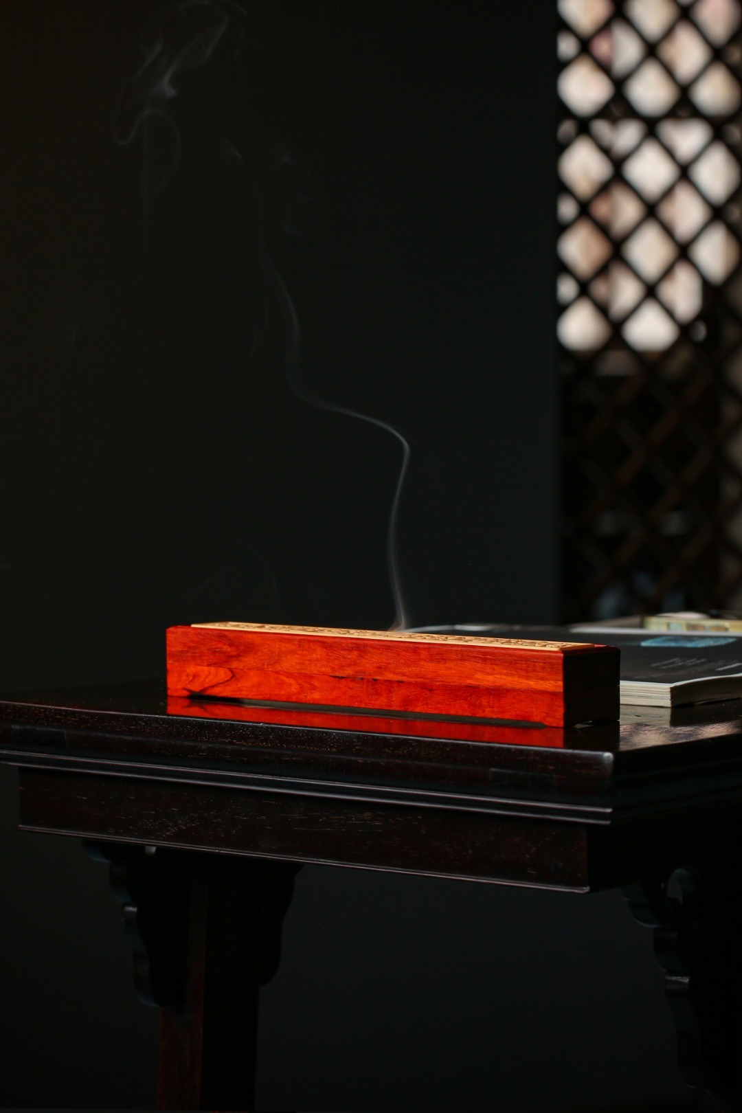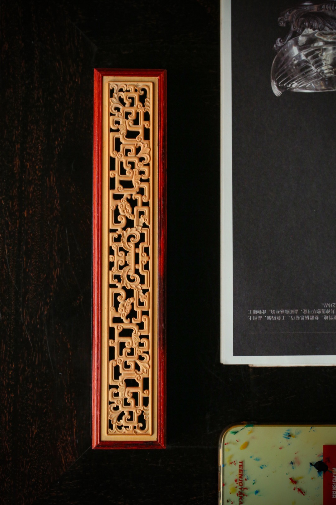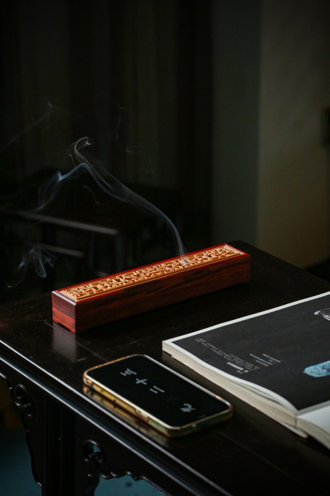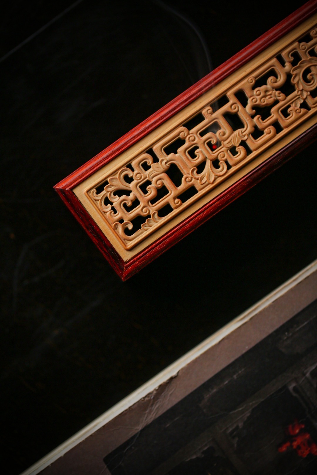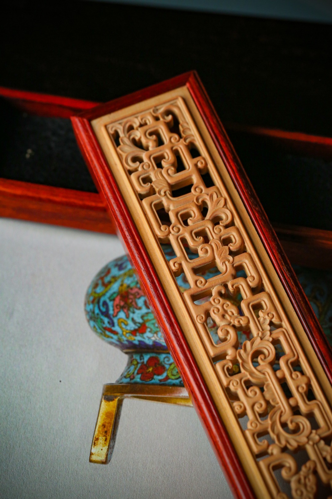小叶紫檀榫卯结构制。黄杨木镂雕螭龙纹,空灵静谧。焚香的妙处在于无形中调动人的灵性,又能安和身心取一瓢清静。