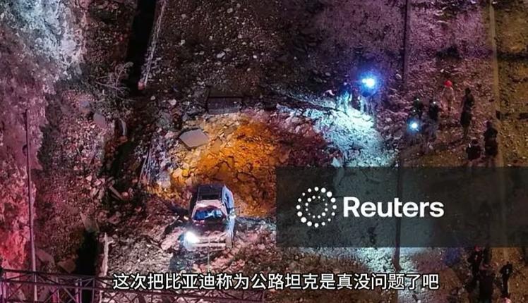 刚刷到特拉维夫那辆元PLUS的消息,真是一声长叹,实战才是最好的广告。 一位在当地的网友拍下了现场,导弹炸出大坑,那辆蓝色的元PLUS(海外叫ATTO 3)就歪在坑边。最绝的不是它没被直接命中,而是这个距离承受冲击波后:车顶没塌,ABC柱看着都还挺着,更神的是双闪灯还在那执着地闪,说明低压电路没罢工。新闻说车主中度受伤,另外几人轻伤。可你得想想,寻常车子在这个当量边上,大概率只剩一堆扭曲的废铁了。 这下真是把桌子掀了。以前总有人说电车如何不安全,迪子宣传什么笼式车身、CTB技术,你们还不信吗?看看这次,硬接钢卷、扛重卡的那些测试,跟这次实战冲击比起来,确实都像模拟考了。它就是在告诉你,它的安全冗余,可能真是为了一些你想不到的极端场景准备的。 现在一想到那些总说“电车一碰就燃”的论调,就觉得有点跟不上时代了。这辆歪在弹坑边的元PLUS,比任何展厅里的光芒万丈都更有说服力。你身边有没有这种,用一次意外就彻底扭转口碑的例子?