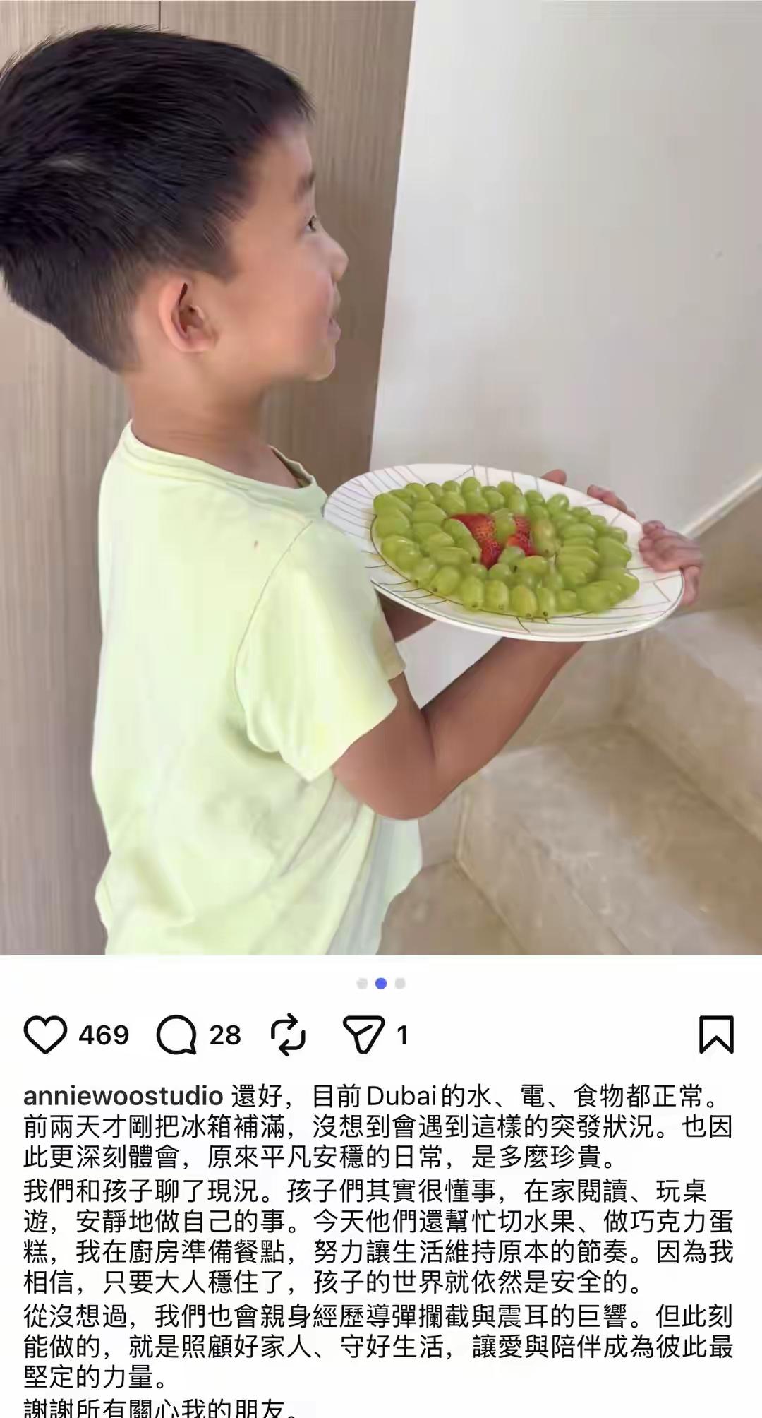 台湾女星吴辰君移居迪拜后,近日因中东战火波及当地生活而受到关注。她通过社交平台报平安,表示虽然经历导弹拦截的巨响与震动,但物资供应正常,生活节奏未乱,暂时无计划离开。 吴辰君描述,某日与儿子在饭厅突闻三声巨响、房屋震动,后得知是拦截飞弹。她坦言当时强忍恐惧,为安抚两个孩子而保持镇定。所幸她提前采购,家中储备充足,水电食物供应如常。孩子们近日居家上网课、阅读游戏,情绪平稳。 经历此事后,吴辰君更感平凡安稳的珍贵。目前一家人决定留在迪拜,因航班受影响且未到必须离开的地步。她90年代凭成龙电影出道,曾活跃于多地影视圈,2012年婚后淡出,随夫移居迪拜生活。