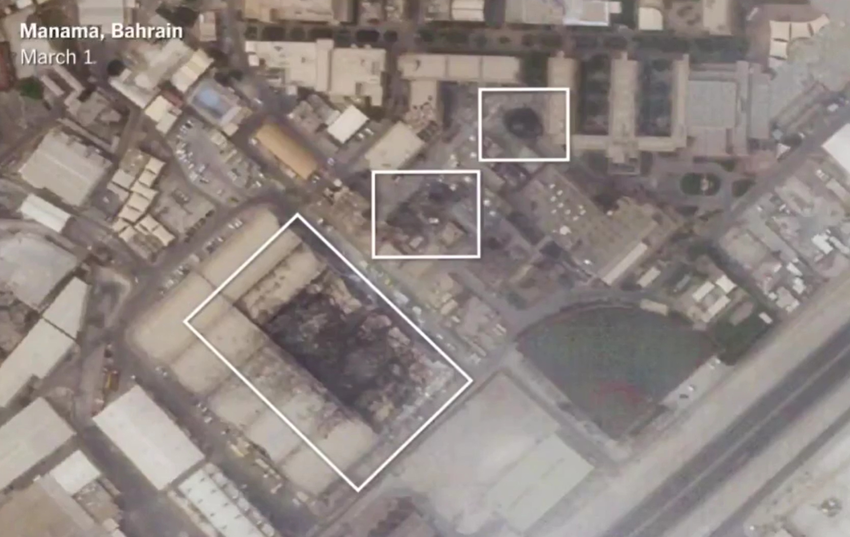 烽火问鼎计划伊朗导弹击中美第五舰队总部瞬间 最新卫星图像表明,位于巴林麦纳麦的美国第五舰队司令部中的全部两台AN/GSC-52B MET卫星通讯终端天线都已被伊朗打击彻底摧毁。