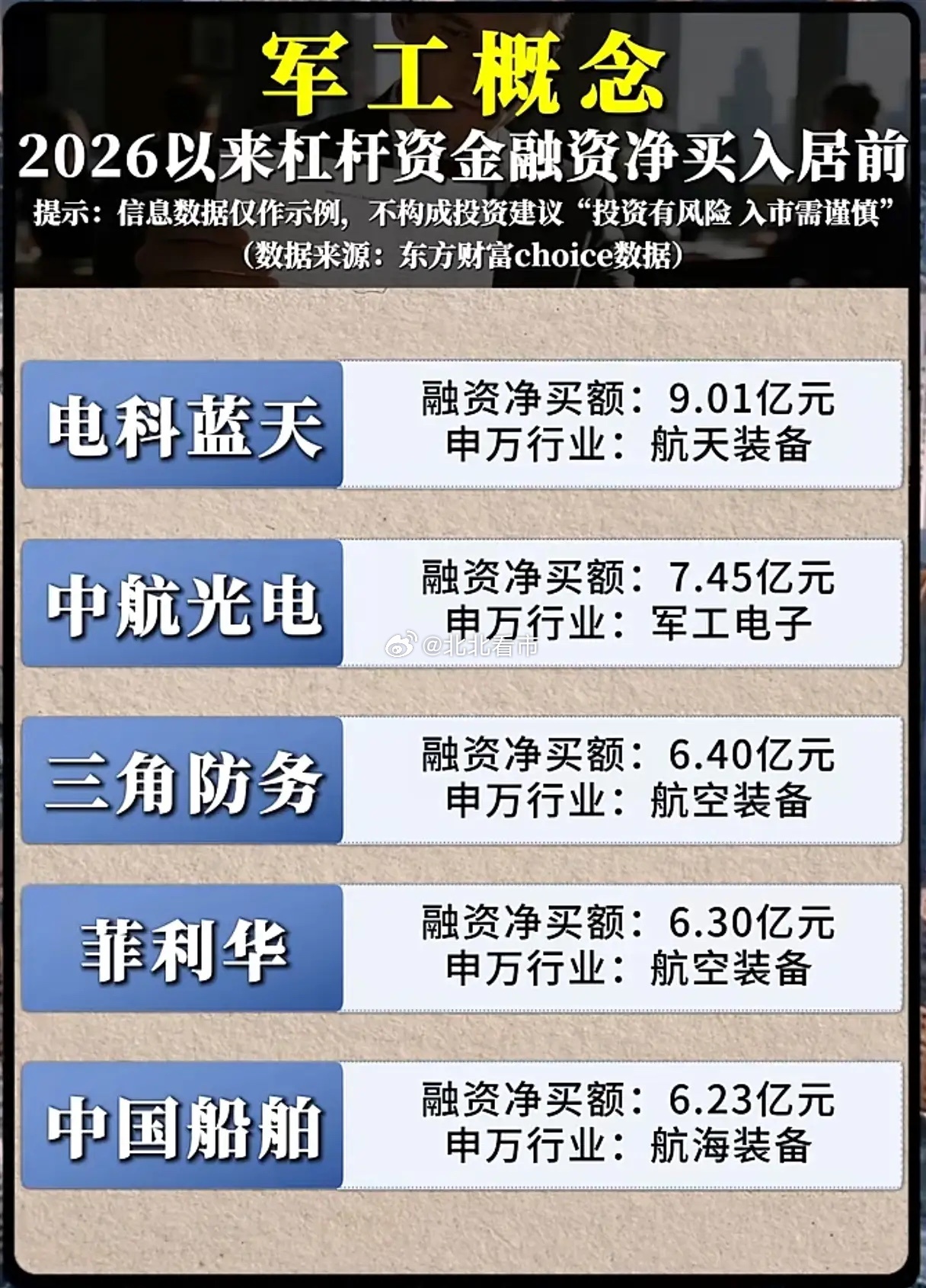 四维战场已至,杠杆资金为何坚定押注军工?2026年开年的军工板块,正被全球变局与技术革命双重点燃。美伊冲突中美国太空部队首次实战、美军批准OpenAI模型接入机密网络、欧洲启动8000亿欧元“再武装计划”,三条重磅消息勾勒出行业全新成长逻辑,而融资客超60亿元的集体加仓,更印证了军工从“题材炒作”到“价值兑现”的质变。从图片里的资金流向看,电科蓝天9.01亿元的融资净买入领跑全场,中航光电、三角防务等紧随其后,资金布局精准锚定航天装备、军工电子、航空制造三大核心赛道。这背后,是战争形态向“海陆空天”四维跨越的必然选择——星链构建的天基作战闭环,让航天装备成为战场神经中枢;AI赋能的情报分析,倒逼军工电子加速国产化替代;而高超音速武器与隐身战机的列装,直接拉动航空材料与制造的订单爆发。如今的军工,早已不是传统的防御性板块。全球军费刚性扩张叠加军贸出口爆发,形成“内需+海外”双轮驱动。中国船舶受益于红海航运安全需求,中航西飞、光启技术承接歼-35量产红利,菲利华的高性能材料、国博电子的射频芯片,更是卡准了技术突破的关键环节。这份信心源于基本面的硬核支撑,但理性同样不可或缺。杠杆资金的“快进快出”属性,注定板块波动会高于普通行业,部分短期涨幅过大的标的,已出现估值与业绩的阶段性脱节。对于投资者而言,与其跟风追高,不如聚焦技术壁垒扎实、订单确定性强的核心标的,在行业长景气周期中,把握产业升级的真正红利。