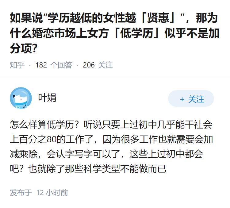 贝贝 2 2026-03-03 07:55 在现在本科都算标配的年代,太低的学历代表这个人家境极差、智商低、好吃懒做、没正溜大概率至少占一样。另外学历太低代表走上社会很早,到了适合结婚的年龄还没定下来的话很多时候和大龄剩女是比较类似的,身上很可能有不少不适合婚恋的属性。所以低学历不会是加分项。另外还有一点就是也存在部分有家庭责任感的女生愿意分担家庭经济的,再就是大城市一部分清醒的女生知道自己的条件找不到拎包入住还不受气的,为了自己的利益被迫选择承担一部分家庭经济找个尽量好的选择。这部分女性拔高了高学历的价值。