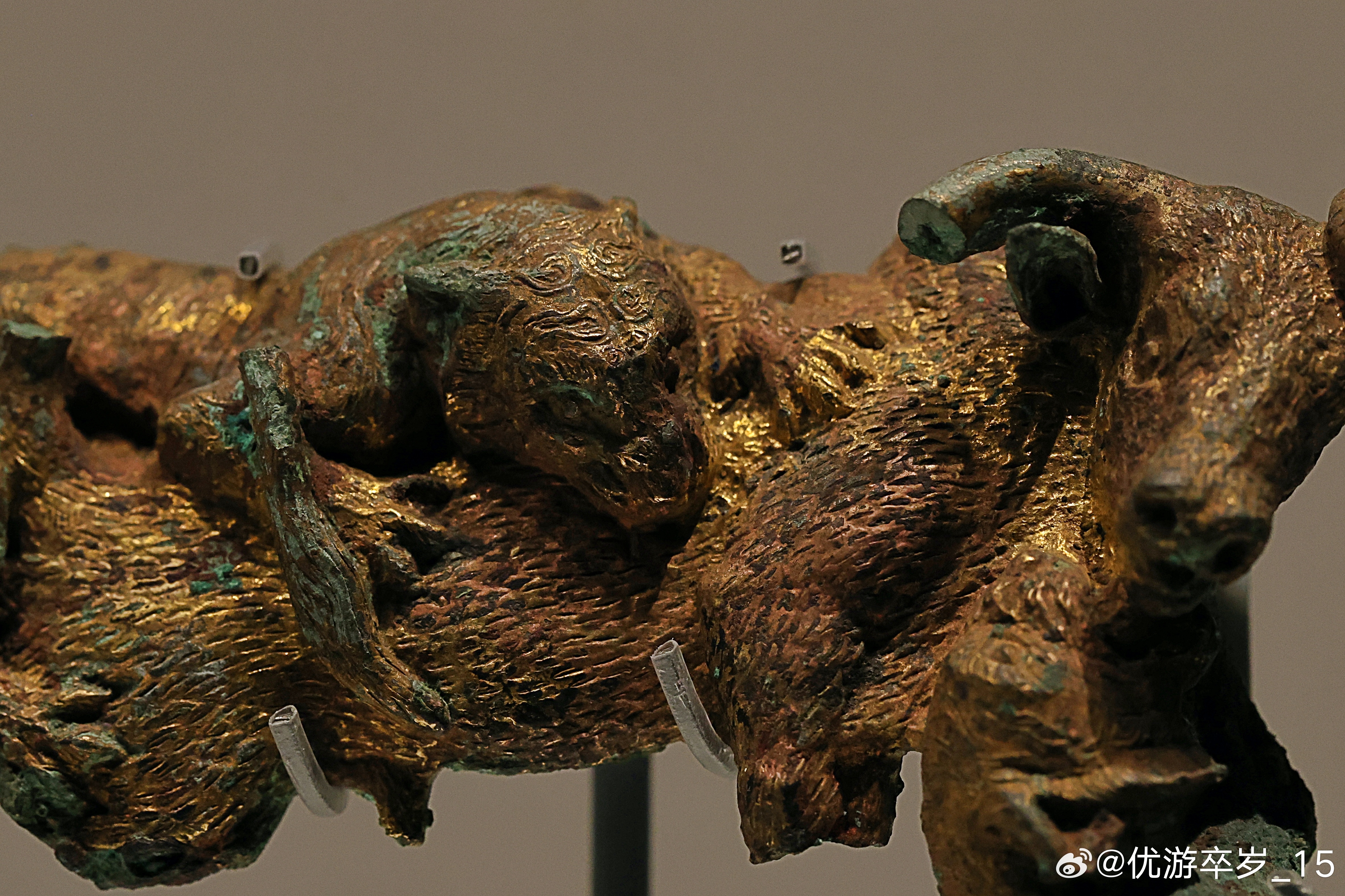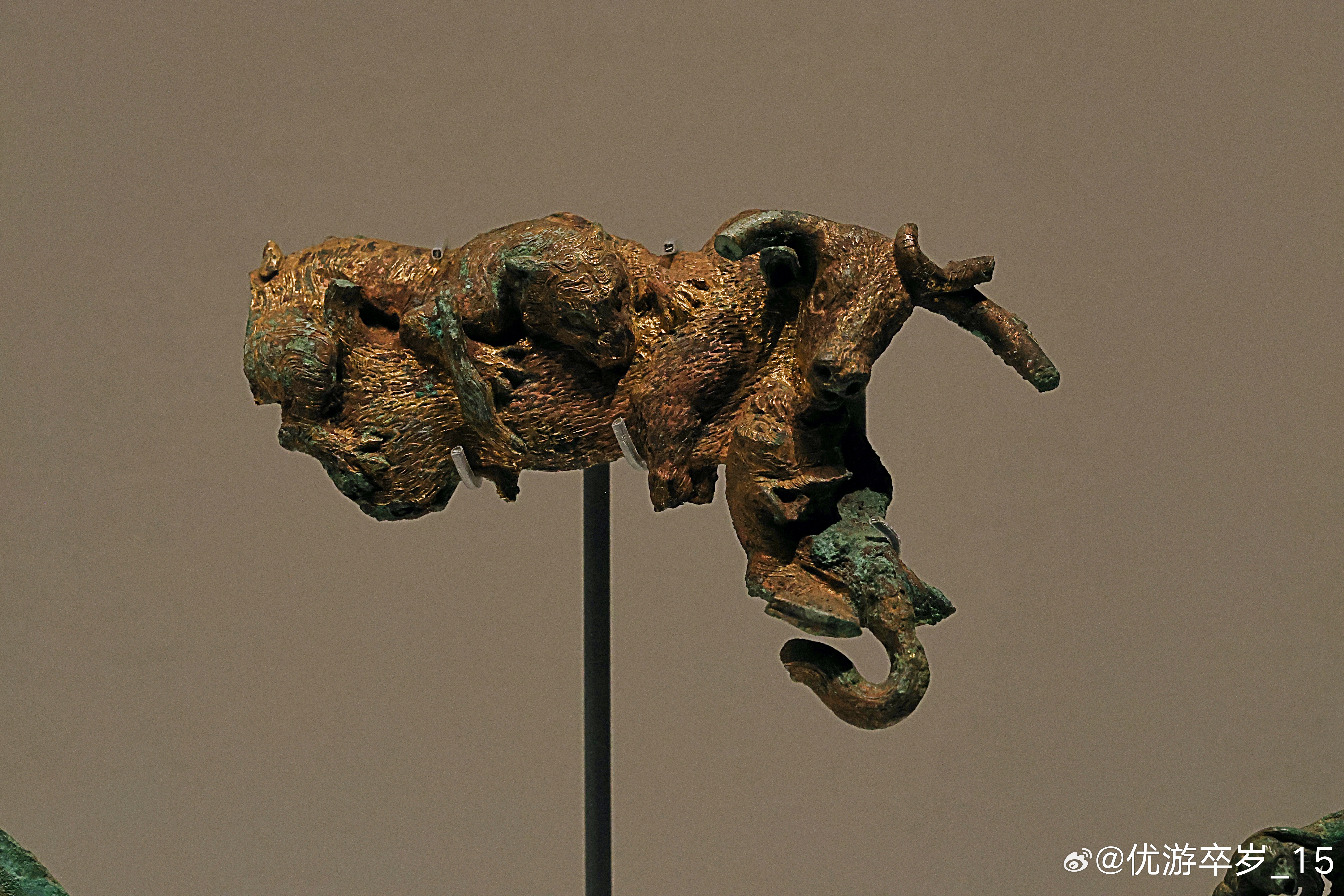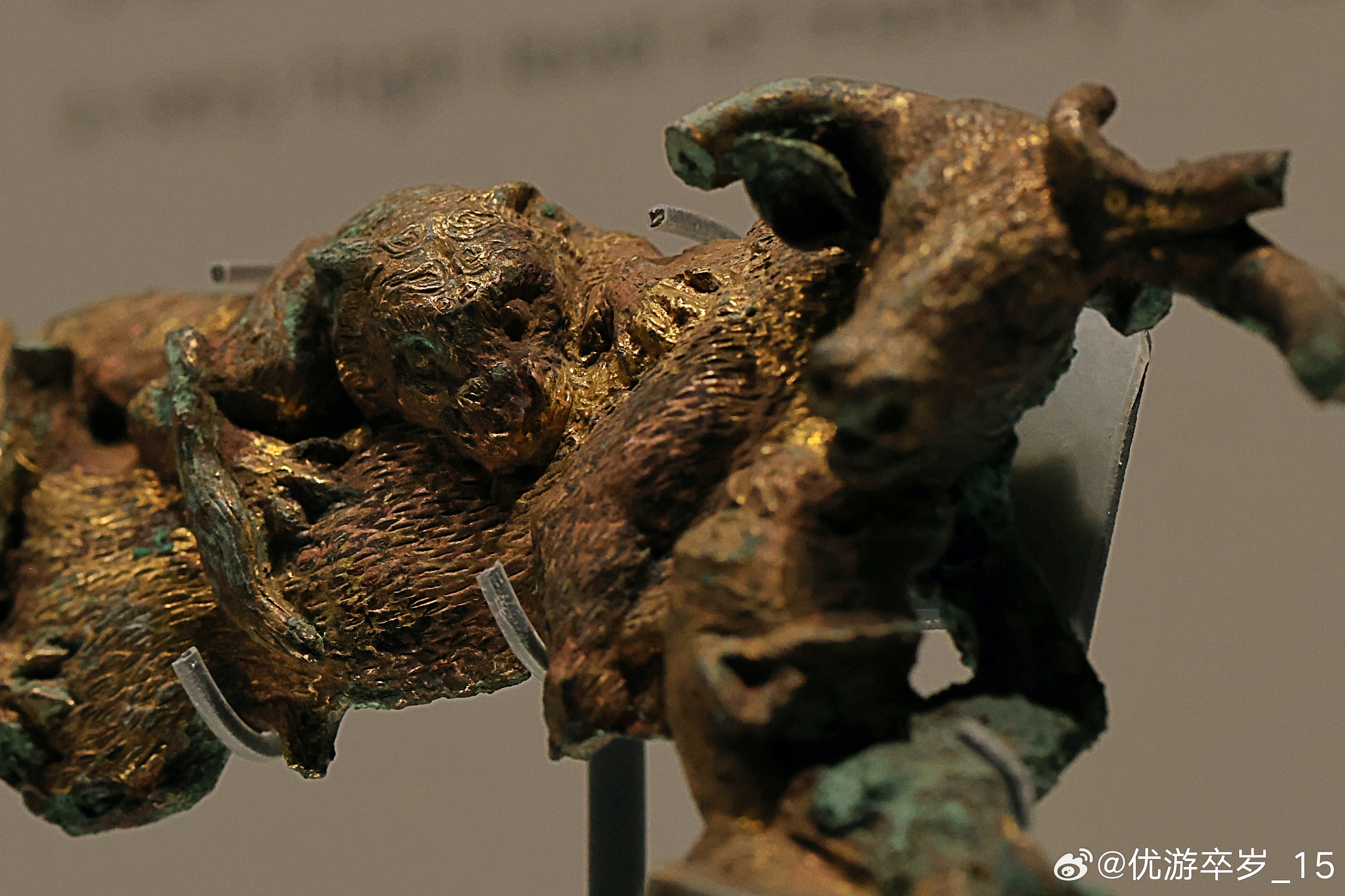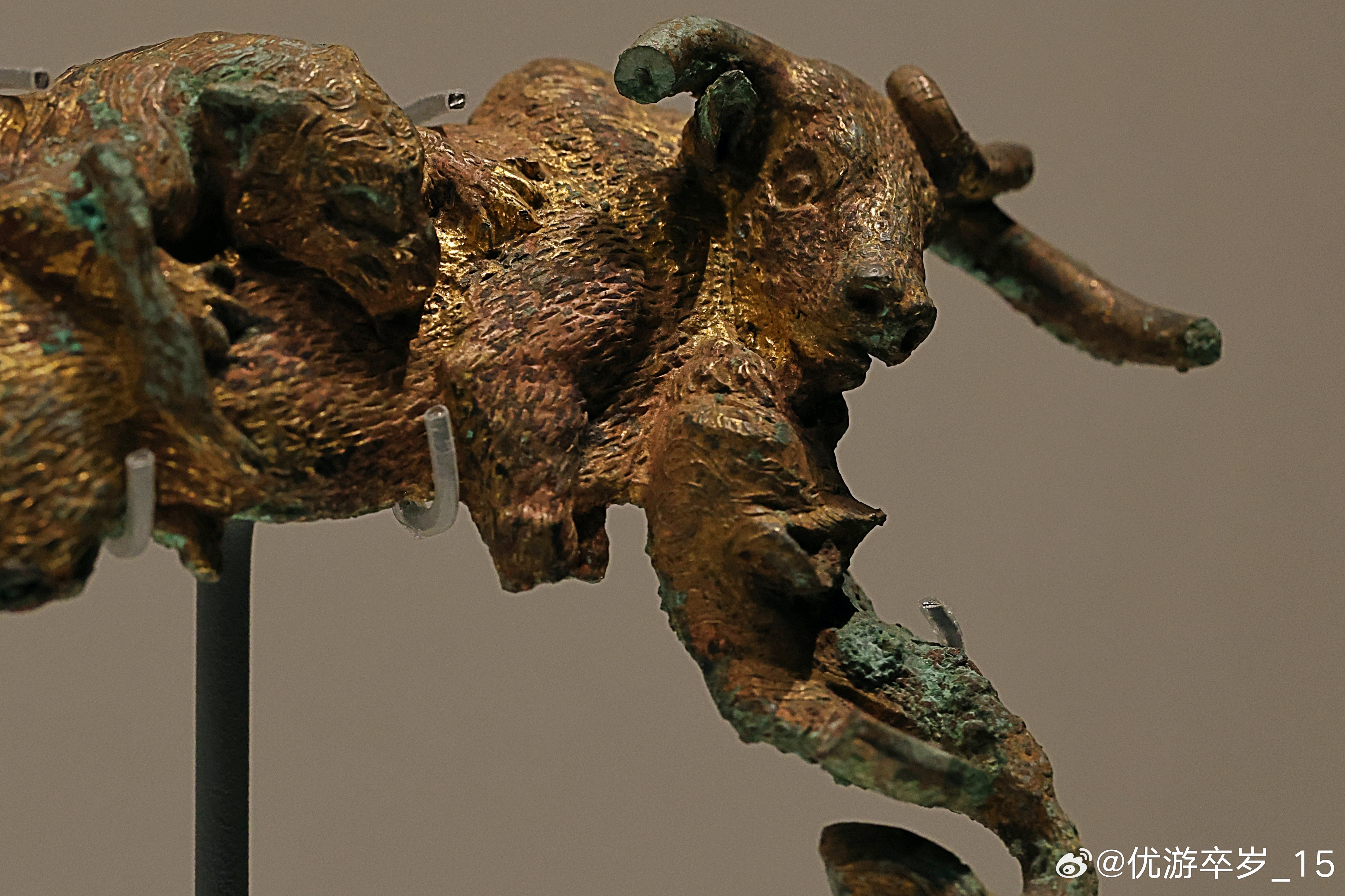 我的2026 鎏金斗兽饰件西汉(公元前 206 年 - 公元 8 年)上海博物馆藏1956 年云南晋宁石寨山滇王墓地出土。再现了一场惊心动魄的野兽搏斗场景:一头公牛被两只猛兽扑咬,公牛奋力挣扎,四肢扭曲。属于古滇国贵族使用的青铜扣饰,背面有挂钩,用于佩戴在衣物或腰带上,既是实用装饰,也是身份与权力的象征。约会博物馆文物