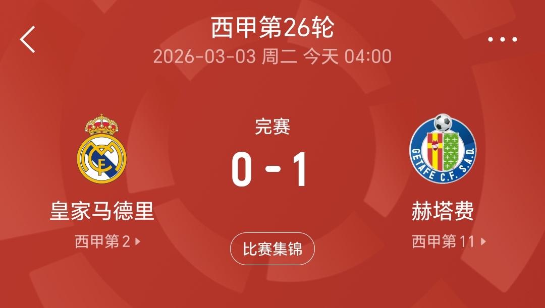 皇马爆冷输球,和西甲冠军渐行渐远,西甲第26轮,皇马主场0:1赫塔菲,遭遇联赛两连败,积分榜上已经落后巴萨4分,本场比赛由于遭遇人员伤病,皇马多名主力未能登场,不过在自己的主场,皇马理应拿下对手,继续给巴萨制造压力,没想到直接爆冷输球,赫塔菲上次客场赢皇马还是18年前,这场比赛的胜利应该能让赫塔菲球迷高兴很长一段时间了,值得一提的皇马中卫赫伊森本场比赛首发,但是也没有起太大的作用,依然被赫塔菲攻破大门,皇马最近有点水逆,不知道是不是因为被之前赫伊森的事情所影响的!