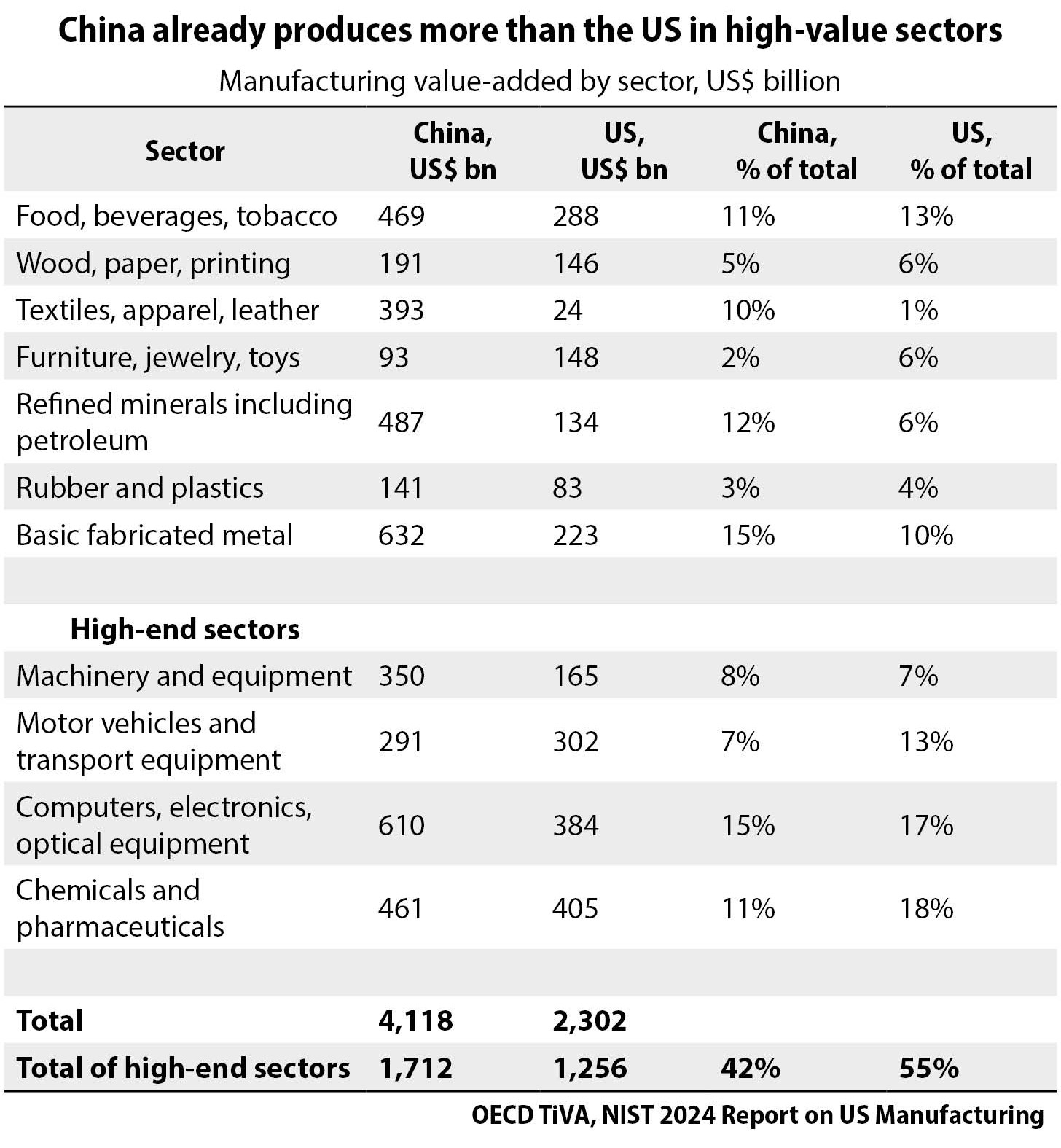 在很多制造业领域,中国的生产能力都远超美国