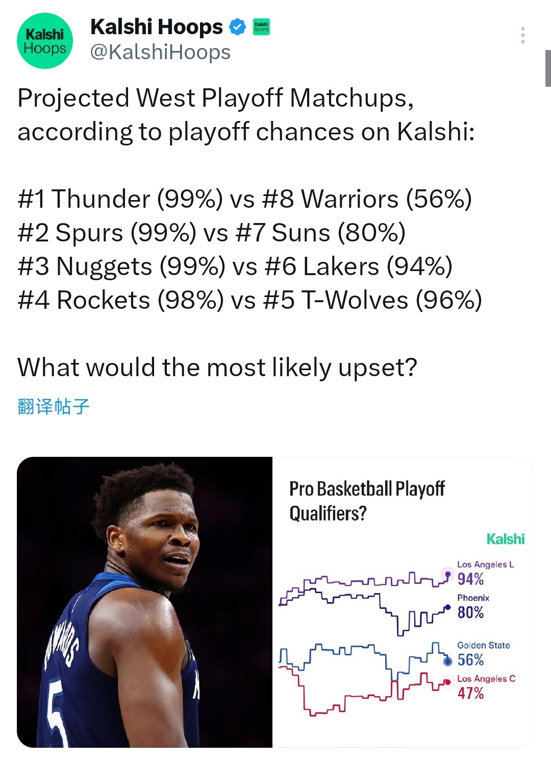 西部季后赛晋级概率以及潜在对阵形势如下:1. 雷霆(99%)对阵勇士(56%)2. 马刺(99%)对阵太阳(80%)3. 掘金(99%)对阵湖人(94%)4. 火箭(98%)对阵森林狼(96%)