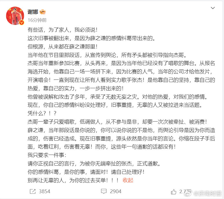 【#谢娜喊话薛之谦回应#】#谢娜说薛之谦伤害了张杰# 3日,喊话:有些话,为了家人,我必须说!这次旧事被翻出来,是因为薛之谦的感情纠葛带出来的。但根源,从来都在薛之谦那里!当年他在节目里那段话,从宣传到舆论,所有矛头都被引导指向杰哥。杰哥当年重新参加比赛,从头再来,是因为当年他已经没有了唱歌的舞台。从报名海选开始,他靠自己一场一场拼下来,因为比赛的人气,当年的公司才给他发片,开演唱会!一直到现在让所有人看到实力歌手张杰!是他靠自己的坚持,靠自己的热爱,靠自己的实力,一步一步拼出来的!他曾被误解和攻击了多年,承受了无数无妄之灾。对他的热爱,对我们的感情。现在,你自己的感情纠纷没处理好,旧事重提,无辜的人又被拉进来当话题。凭什么?!?杰哥一辈子只爱唱歌,低调做人,从不参与是非,却要一次次被牵扯、被消费!薛之谦,当年那段话是你说的,你可以说你说的不是他,而舆论引导是因为你而造成的,伤害已经造成。现在旧事重提,源头依然是你当年的言论。你缩在段子手后面,吃着红利,伤害着无辜!而你,这些年一句道歉的话都没有!我只要求一件事:请你正视自己的言行,为被你无端牵扯的张杰,正式道歉。你的感情纠葛,是你的事,请面对!请自己处理好!别再让无辜的人,为你的过去买单!!!