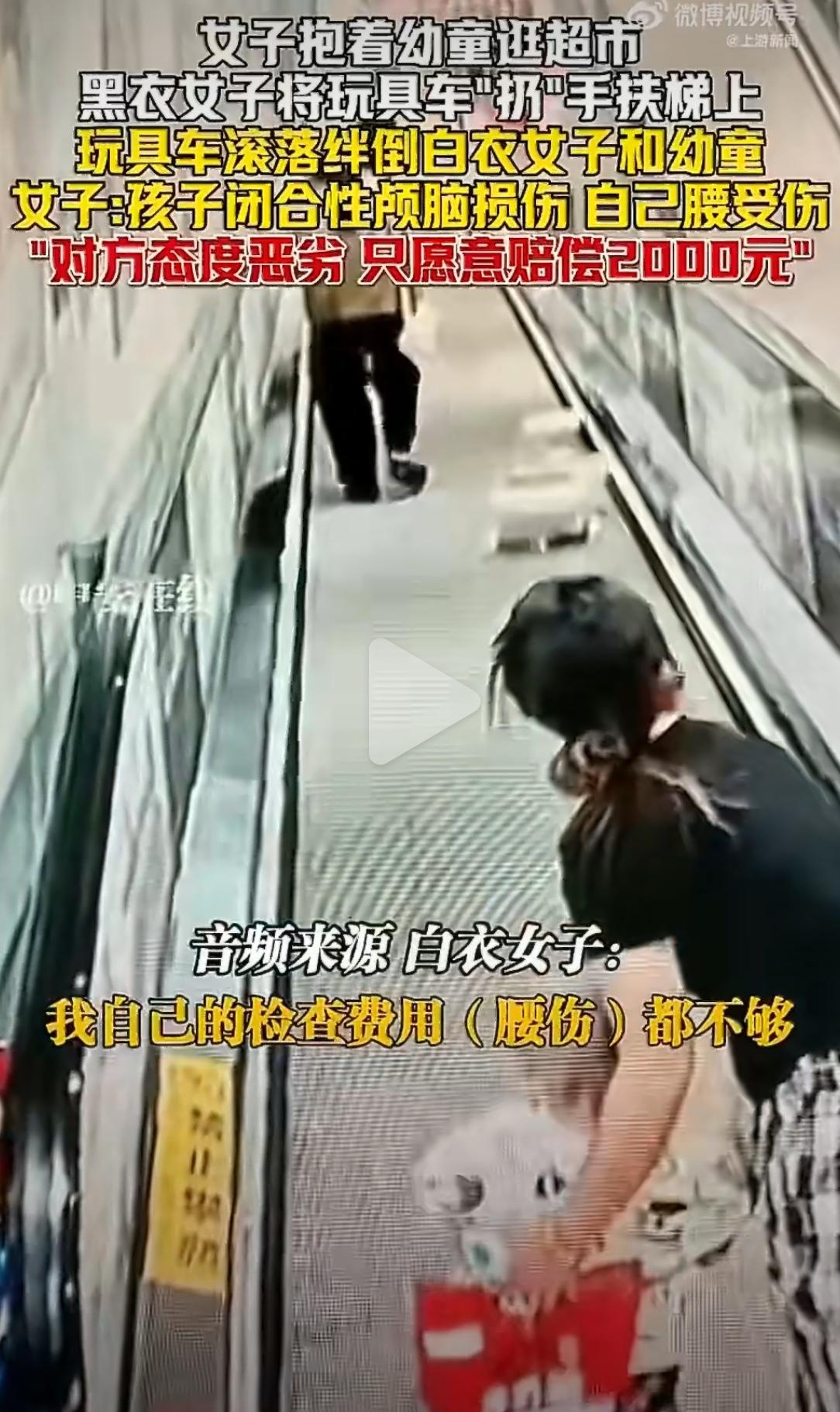 云南一位妈妈带着孩子逛超市,怎么也没想到,一个随手扔下的玩具车,会砸碎一个家的平静。 监控画面里,黑衣女子将玩具车“扔”在手扶梯上,车子顺势滚落,绊倒了前面的白衣女子和她怀里的幼童。孩子当场摔懵,诊断为闭合性颅脑损伤,妈妈的腰部也受了伤。 可更让这位妈妈心寒的,是后续的赔偿。对方态度强硬,只愿意出2000块,还一副“爱要不要”的样子。 网友看完炸了:“2000?孩子脑损伤就值2000?”“这是把人当叫花子打发呢。”“扔玩具的时候多潇洒,赔钱的时候多抠门。” 也有人替妈妈后怕:“闭合性颅脑损伤可大可小,万一留下后遗症,2000块够干嘛?” 事情闹大后,对方才勉强松口,说愿意再协商。可这位妈妈说,她要的不只是钱,是一个态度,是一个“做错事就该承担责任”的道理。 一个随手扔下的玩具车,扔出的是一个孩子的健康,一个家庭的焦虑,还有两个陌生人之间本不该有的拉扯。