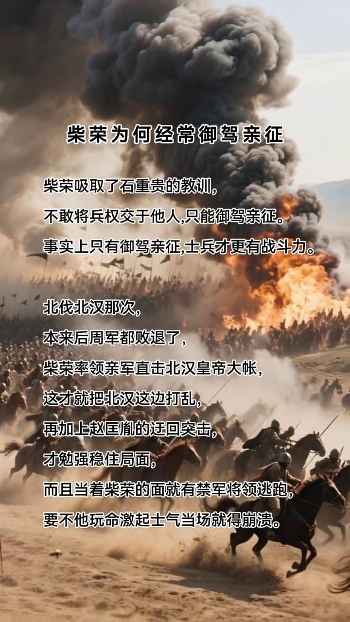 柴荣为何经常御驾亲征? 柴荣吸取了石重贵的教训,不敢将兵权交于他人,只能御驾亲征。事实上只有御驾亲征,士兵才更有战斗力。 北伐北汉那次,本来后周军都败退了,柴荣率领亲军直击北汉皇帝大帐,这才就把北汉这边打乱,再加上赵匡胤的迂回突击,才勉强稳住局面。而且当着柴荣的面就有禁军将领逃跑,要不他玩命激起士气当场就得崩溃。