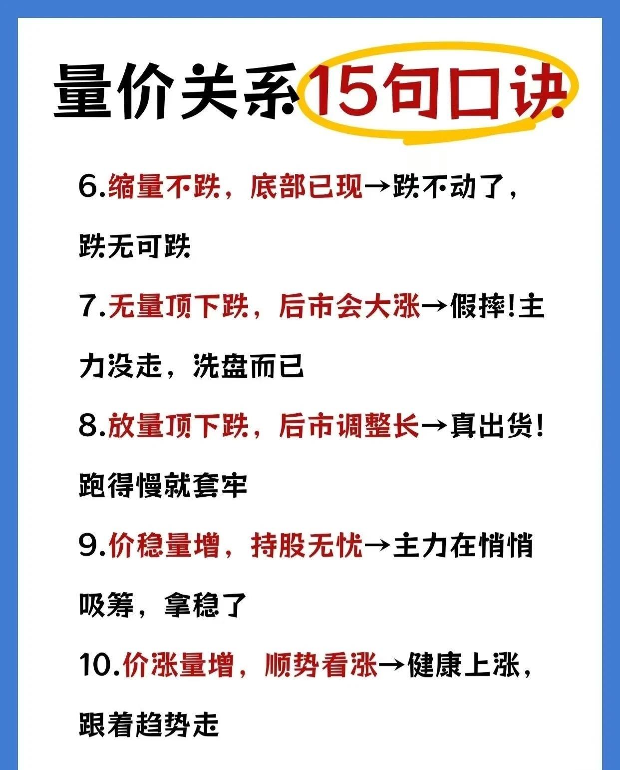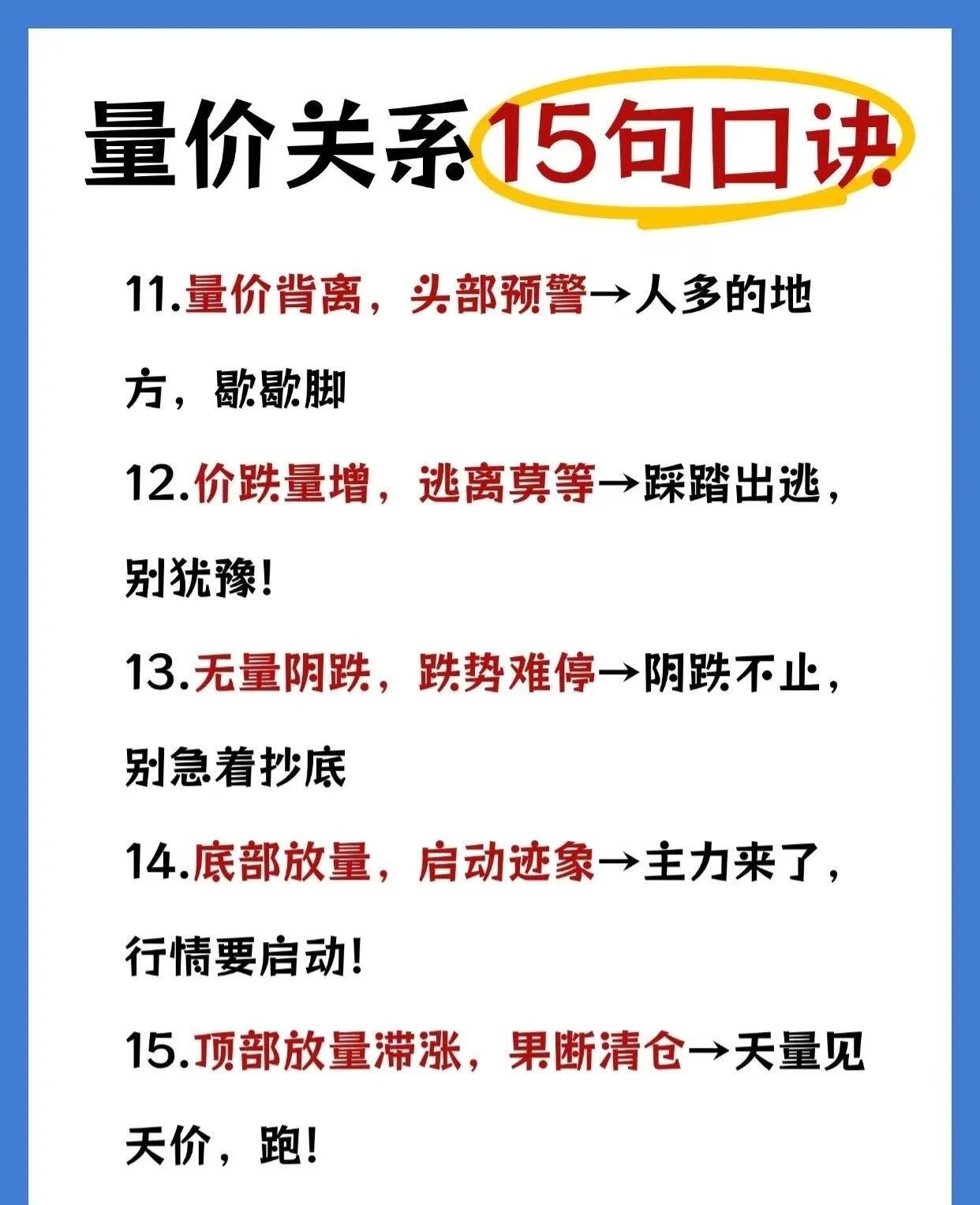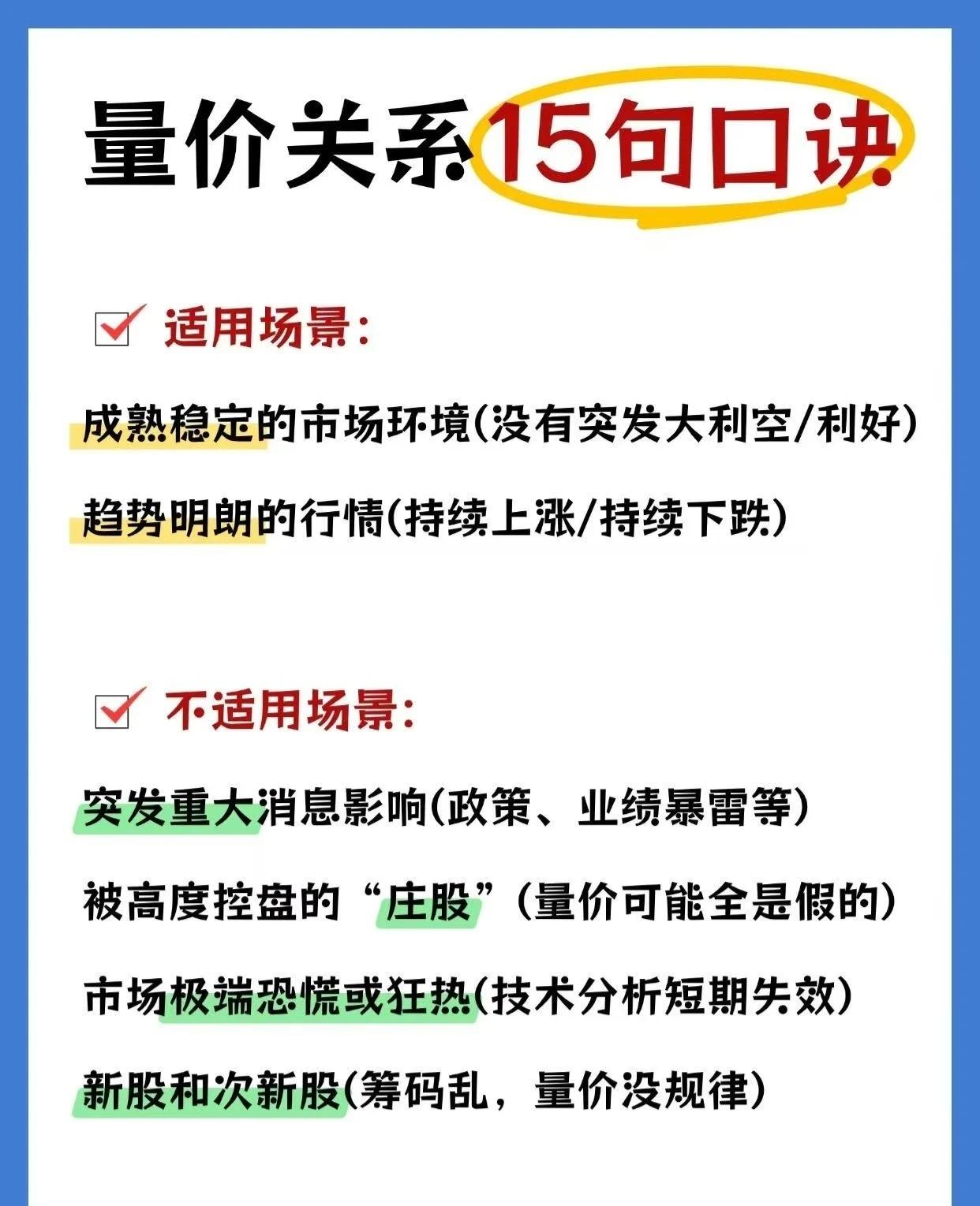这是一套量价关系的15句口诀,涵盖了15种常见的量价配合形态及其对应的市场判断和操作建议,并明确了其适用与不适用的市场环境。以下是详细总结: 一、 量价关系15句口诀(1-15条) 1. 放量上涨,必然回调→人多歇脚(短期可能调整)。 2. 放量下跌,必然反弹→恐慌抛售后必有反抽(短期超跌反弹)。 3. 缩量上涨,继续上涨→大家都惜售,还能涨(强势信号)。 4. 缩量下跌,还要下跌→没人接盘,还得阴跌(弱势信号)。 5. 放量不涨,头部已现→雷声大雨点小,危险信号(见顶风险)。 6. 缩量不跌,底部已现→跌不动了,跌无可跌(筑底信号)。 7. 无量顶下跌,后市会大涨→假摔!主力没走,洗盘而已(洗盘信号)。 8. 放量顶下跌,后市调整长→真出货!跑得慢就套牢(出货信号)。 9. 价稳量增,持股无忧→主力在悄悄吸筹,拿稳了(吸筹信号)。 10. 价涨量增,顺势看涨→健康上涨,跟着趋势走(上涨趋势确认)。 11. 量价背离,头部预警→人多的地方歇歇脚(见顶前兆)。 12. 价跌量增,逃离莫等→踩踏出逃,别犹豫!(风险极大,赶紧跑)。 13. 无量阴跌,跌势难停→阴跌不止,别急着抄底(风险大,不抄底)。 14. 底部放量,启动迹象→主力来了,行情要启动!(建仓/启动信号)。 15. 顶部放量滞涨,果断清仓→天量见天价,跑!(高位出货信号)。 二、 适用场景 * 成熟稳定的市场环境(没有突发大利空/利好)。 * 趋势明朗的行情(持续上涨/持续下跌)。 三、 不适用场景(警惕!) * 突发重大消息影响(如政策、业绩暴雷等,量价关系可能被打乱)。 * 被高度控盘的“庄股”(量价可能是假的,主力操控)。 * 市场极端恐慌或狂热(技术分析短期失效,情绪主导)。 * 新股和次新股(筹码乱,量价没规律)。 ✅ 一句话总结: 这套口诀是股市量价分析的“速查手册”,帮助投资者通过成交量与价格的配合快速判断趋势强弱和买卖时机,但必须在成熟稳定、趋势明确的市场中使用,避免在突发消息、庄股、极端情绪或新股次新等场景盲目套用。