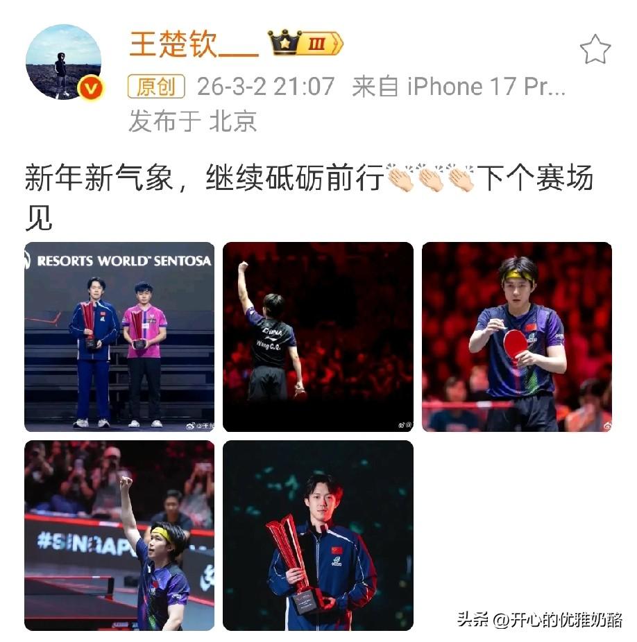 王楚钦惜字如金,继续砥砺前行。 王楚钦更新没有长篇大论,也没有各种感谢,只表明态度和决心。 王楚钦分享五张图片,比搭档多一张,巧合的是第一张都是和亚军合影,多一张比赛现场图,最后一张也是冠军城市宣传片。 王楚钦同样没发男单女单冠军自拍,也没有城市宣传片的顶峰相见,不知道是默契还是约好的。 不过这都不重要,媒体上都霸屏了,选择低调一点也挺好。 王楚钦说下个赛场见,相信重庆冠军赛一定还会顶峰相见。 图片来自网络侵权可删。