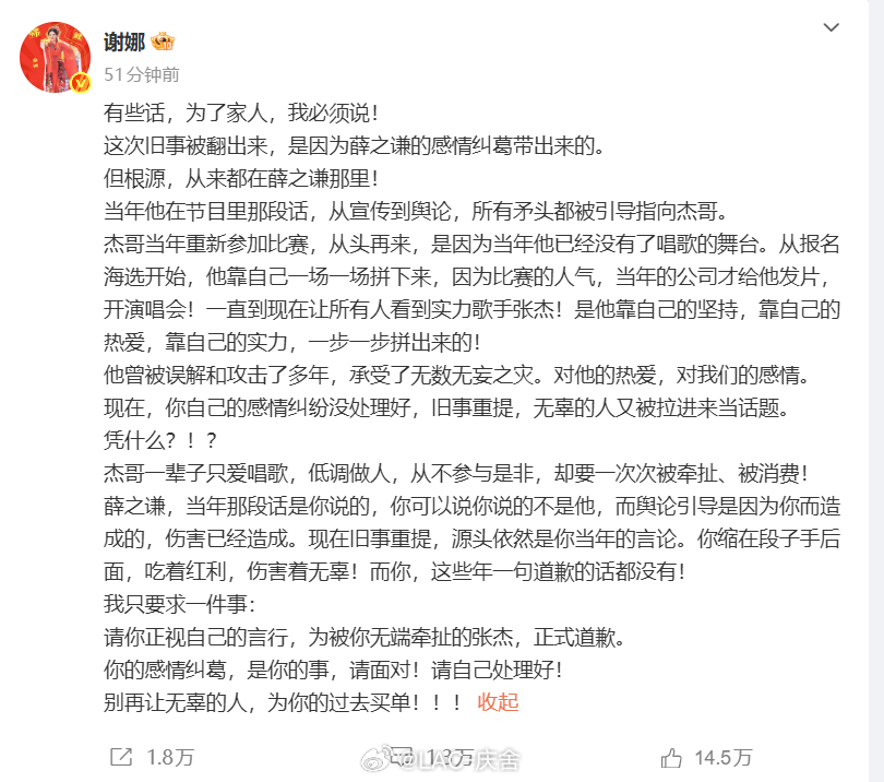 谢娜喊话薛之谦 没想到陈年旧事现在又被拿出来说,谢娜这次是真的护夫心切直接发博力挺。本来是别人的感情瓜,结果无辜被牵连,换谁都会不舒服吧?