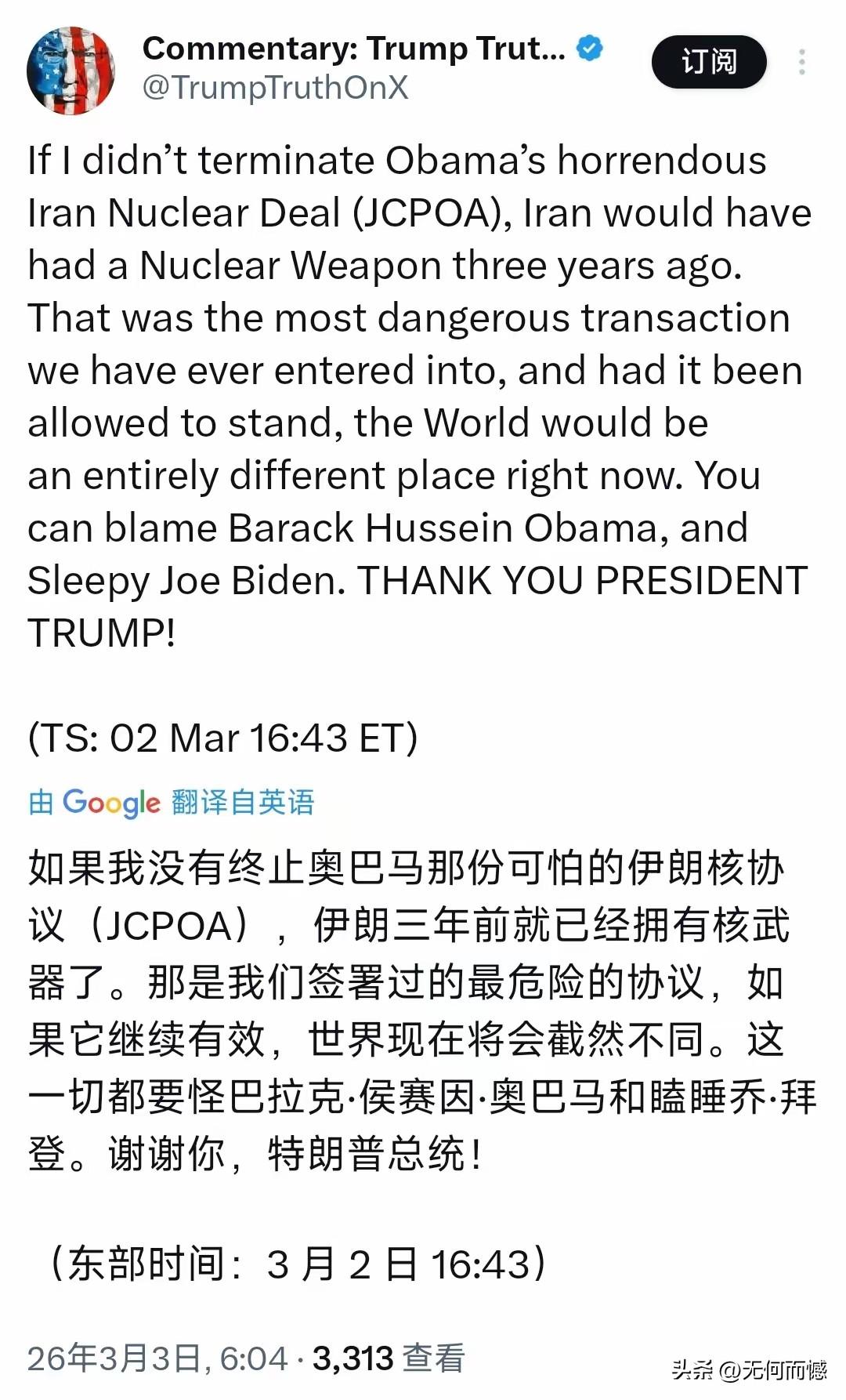 老特再次发文,在标榜自己的同时,又在内涵奥巴马和拜登,他的这套话术最大的特点就是,虚中有实,实中有虚,虚虚实实,难以揣测,不知道他最后真实表达的意图是什么,乍一看的时候,以为是在标榜自己,以为是在贬低别人,实际上并不是那么简单,他很懂得三十六计,有时候是声东击西,有时候是假痴不巅,有时候是以逸待劳,手段五花八门,层出不穷,是很难对付的!