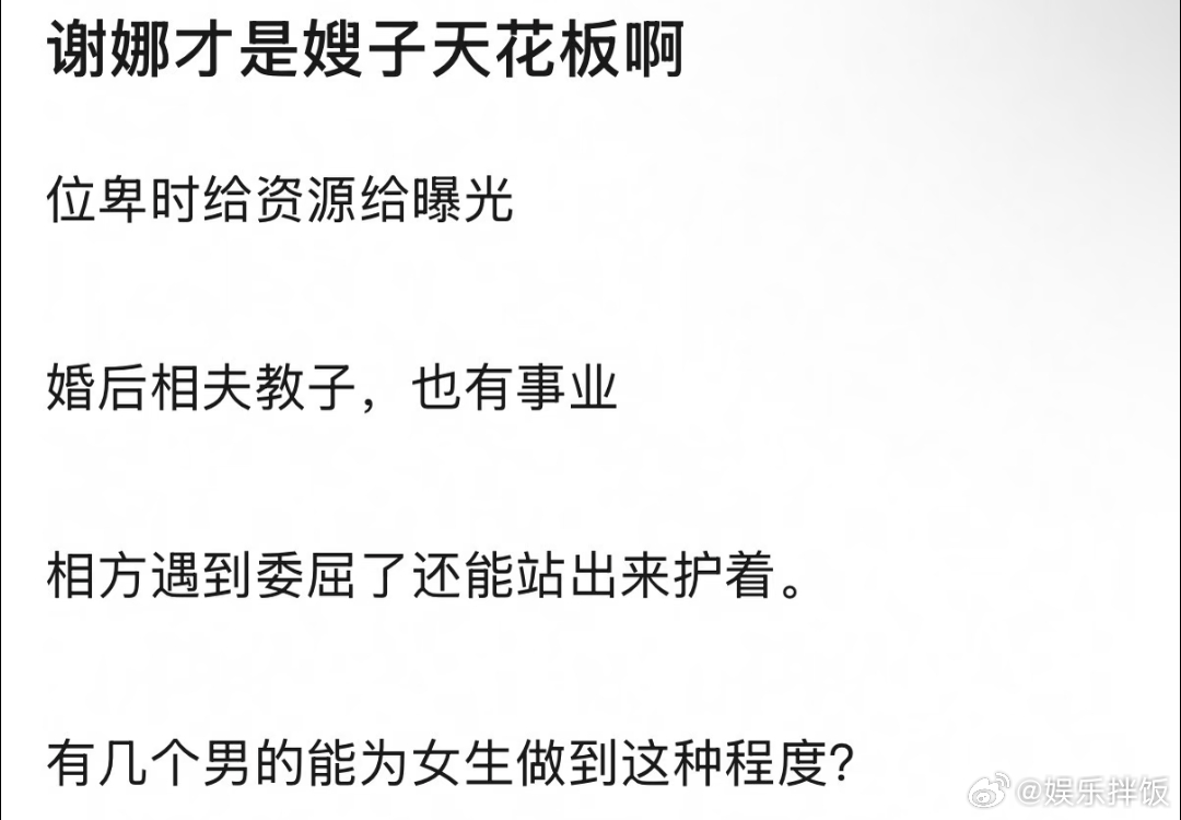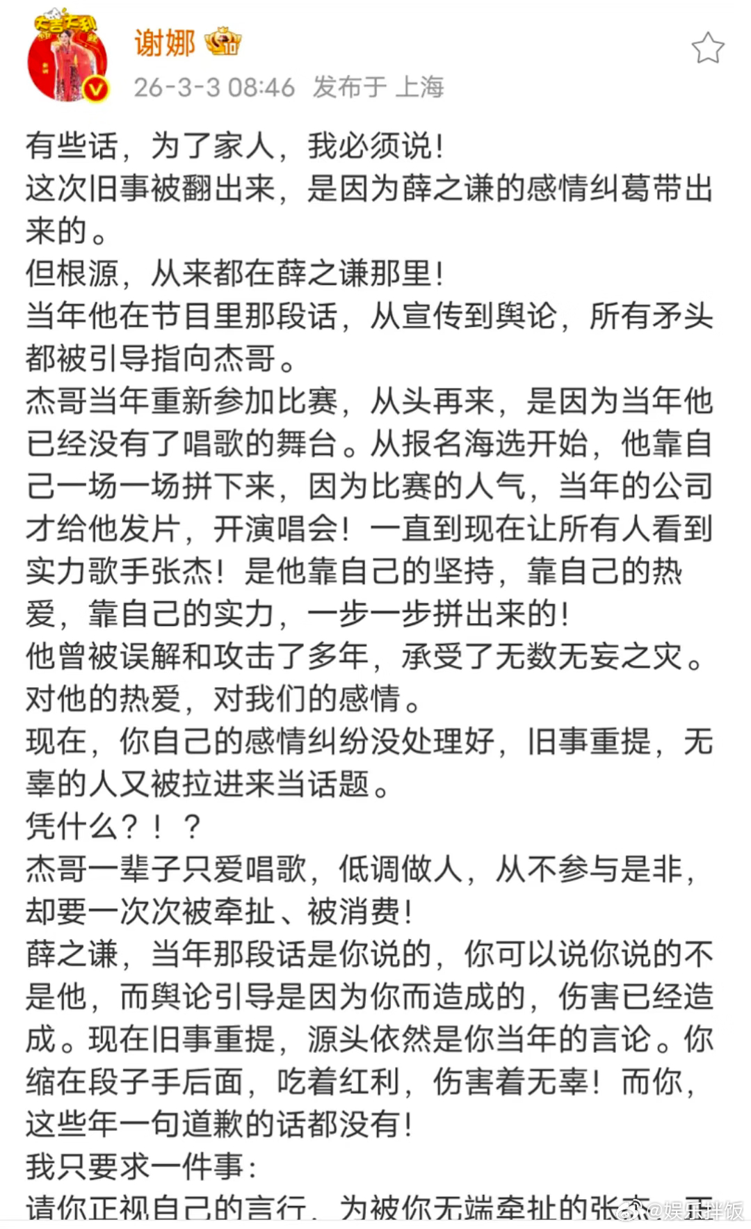 谢娜内娱嫂子天花板 谢娜真的好聪明,把矛头直指薛之谦,薛之谦洗白的话也别狡辩自己没有指名道姓说的不是张杰,毕竟给人家造成的伤害影响是实打实了,人家俩口子互帮互助,轮得到外人说三道四吗自从我发现张杰谢娜这两口子都是特别好的人就已经开始嗑生嗑死了!娜姐也是有事真上,这才是内娱嫂子天花板谢娜喊话薛之谦