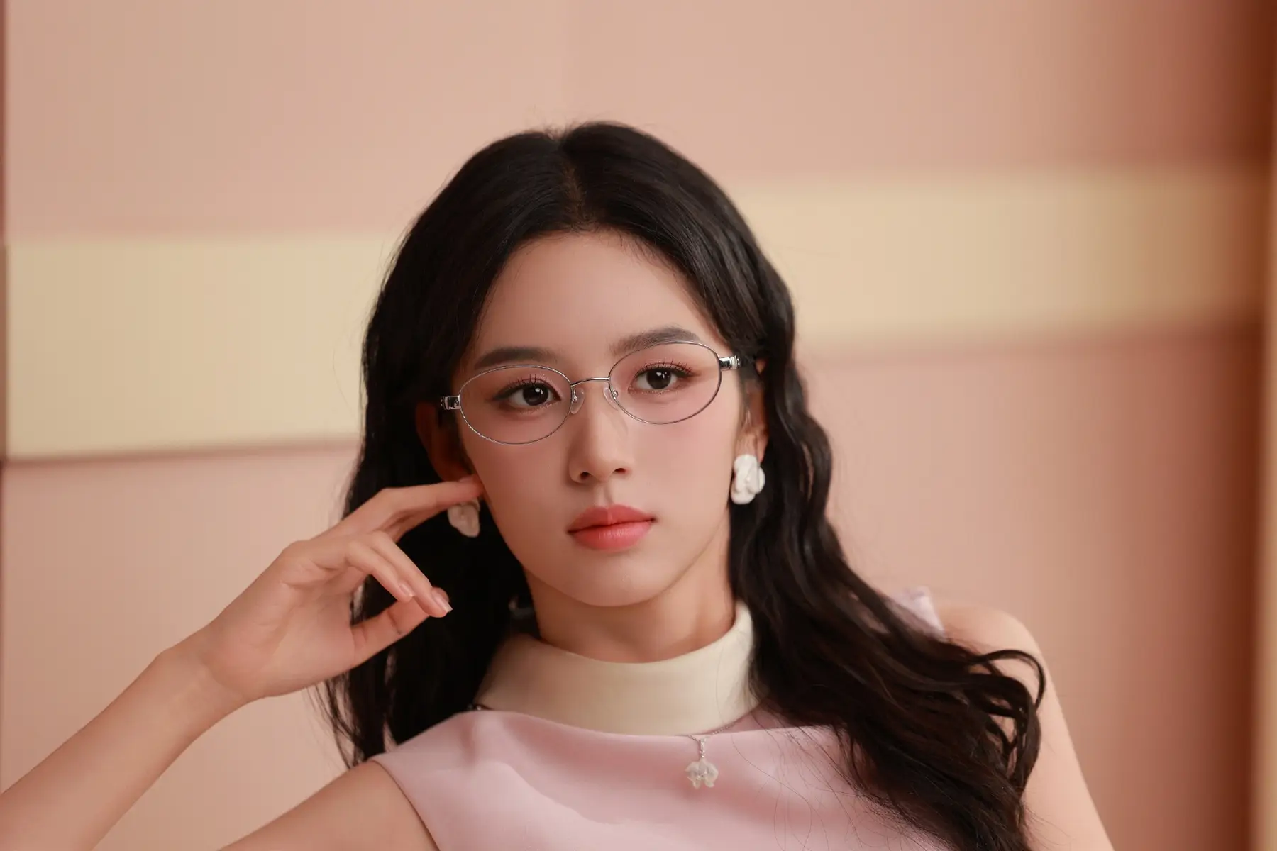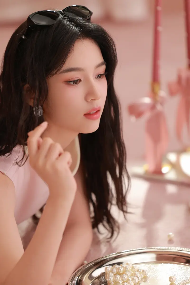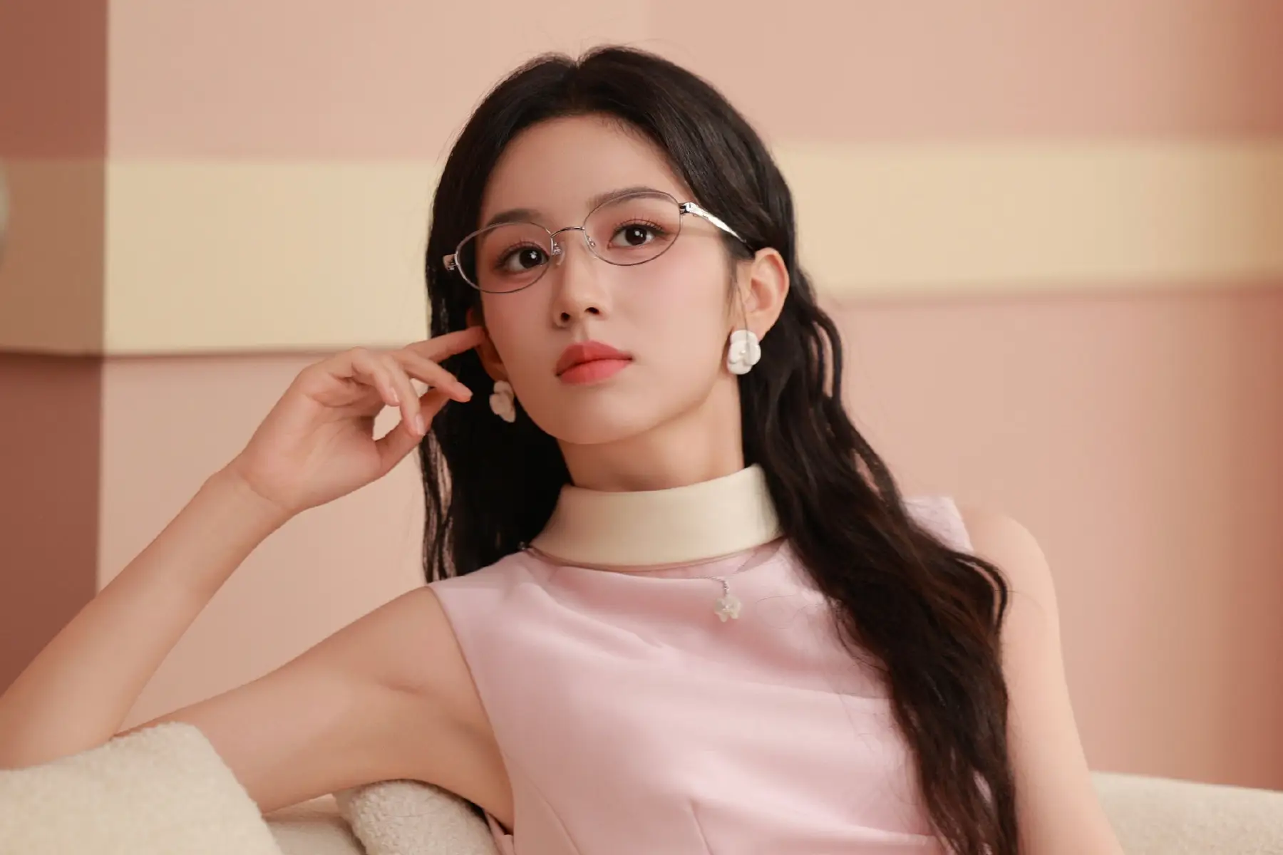周也戴细框金属眼镜知性优雅 穿粉裙尽显文艺少女感