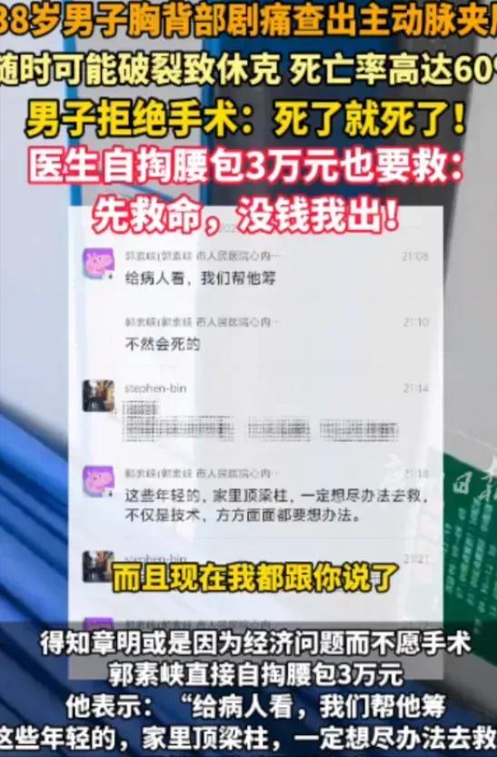 “这医生火了!”广东,38岁男子查出主动脉夹层,死亡率高达70%!可男子却拒绝手术,只想回老家,还对医生说:死了就死了吧!本以为医生会遵从男子意愿,没想到,医生竟然自掏腰包3万元:先救命,没钱我出!这些年轻的,家里顶梁柱,一定想尽办法去救! 38岁的外来务工者章明在工作时突然感到胸背部传来剧烈的撕裂样疼痛,在工友的帮助下,他被紧急送往医院接受检查,结果让在场医护人员都捏了一把冷汗。 章明被确诊为急性主动脉夹层Ⅲ型,这是一种极其凶险的心血管急症,发病后每拖延一小时,死亡风险就会显著上升,一周内死亡率最高可达70%。 一旦血管发生破裂,就算近在手术室门口,也几乎没有挽回的可能。 医护人员当即给出治疗方案,必须立刻住院,紧急开展手术,才能保住这条年轻的生命。 可当章明了解到整体治疗费用与个人需要承担的部分后,原本苍白的脸上,多了一层难以掩饰的绝望。 他是家里唯一的经济支柱,上有老人需要赡养,下有子女需要照顾,全家的生活都压在他一个人肩上。 异地就医的报销比例有限,对本就拮据的家庭来说,自费部分无异于一笔天文数字。 他不想因为自己的病,把整个家庭拖入沉重的债务深渊,思来想去,他做出了一个让人心酸的决定。 他拒绝接受任何手术,坚持要收拾东西返回陕西老家,不愿再浪费一分钱治疗费。 面对医护人员的反复劝说,他只是沉默摇头,语气里满是认命般的疲惫。 在生死面前,这个顶天立地的男人,选择把生的机会放弃,把生存的压力留给自己。 在场的医护人员看着眼前这个被生活压得喘不过气的患者,既心疼又焦急,他们很清楚,一旦患者离开医院,几乎等同于走向死亡。 就在所有人一筹莫展的时候,科室主任郭素峡做出了一个让人意外又感动的选择。 她没有再进行过多劝说,而是直接通过微信转账3万元给主管医生,用来垫付患者的住院与手术押金。 她只有一个简单又坚定的想法,先救命,钱的事情不用患者操心。 在她看来,38岁正是一个男人承担家庭责任的年纪,是全家的顶梁柱,只要人还在,这个家就不会散。 只要有一线希望,就必须拼尽全力把人从死亡线上拉回来。 当章明得知医生自掏腰包为自己垫付费用时,这个一直强撑着不肯示弱的男人,终于卸下了所有坚强。 他不再坚持回家,同意接受手术治疗,医护团队迅速为他完善术前准备,争分夺秒与死神赛跑。 整场手术持续了九个多小时,过程十分顺利,夹层破口被成功隔绝,血管血流恢复正常,章明彻底脱离了生命危险。 术后的日子里,医护人员精心照料,帮助他一步步恢复身体。 远在老家的家属接到消息后连夜赶来,面对救命恩人,他们除了深深的鞠躬与感谢,再也说不出更多话语。 这件事被报道后,迅速在网络上引发广泛关注,话题阅读量持续走高,无数网友为郭素峡医生的举动点赞。 在很多人的印象里,医患关系时常被负面新闻笼罩,可这一次,人们看到了最纯粹的善意与担当。 医生垫付的不只是3万元钱,更是一个家庭的希望,是一条鲜活的生命,是一份不抛弃不放弃的职业信仰。 从医学角度来看,主动脉夹层发病急、死亡率高,对救治时间的要求极高,现实中,不少患者会因为经济、认知等原因放弃治疗,留下无法弥补的遗憾。 郭素峡医生的举动,不仅打破了患者对费用的顾虑,更用行动诠释了什么叫生命至上。 她不是不清楚这笔钱可能面临无法收回的风险,也不是不明白日常工作的忙碌与压力。 可在生命面前,所有顾虑都被抛在脑后,她只记得自己是一名医生,救人是刻在骨子里的职责。 这样的举动,看似偶然,实则是长期以来医者初心与职业素养的自然流露。 在广东,在全国,还有无数像郭素峡一样的医护人员。 他们在平凡的岗位上默默坚守,在危急时刻挺身而出,用专业能力与温暖善意,守护着千家万户的平安。 他们见过太多病痛与离别,却依然愿意对每一个陌生生命倾尽全力。 他们不追求名利与掌声,只希望自己经手的每一位患者,都能平安走出医院,回到家人身边。 章明的幸运,在于他在最绝望的时候,遇到了愿意为他撑起一片天的医者。 而我们每一个人的幸运,在于身边始终有这样一群白衣天使,在黑暗中为我们点亮希望的灯。 这件事也在提醒着更多人,生活或许总有艰难,命运偶尔会带来考验,但总有人愿意为你伸出援手,总有人把你的生命看得比一切都重要。