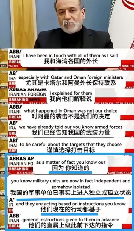 伊朗打击海湾国家的真相是这样的,伊朗外长阿拉格齐说:“我和海湾各国的外长,尤其是卡塔尔和阿曼的外长保持联系,我向他们解释说,对阿曼的袭击不是我们的决定。我们已经告知我国的武装力量,请谨慎选择打击目标。因为你知道的,我国的军事单位已事实上进入独立和孤立状态,他们现在的行动都基于他们的直属上级此前下达的指令。” 阿拉格齐想表明的是,由于此前对伊朗军事单位下达指令的直属上级已被特朗普“清除”,伊朗现在没人能让军事单位停止继续打击美军基地所在国的行动,充其量能对“独立和孤立状态”的军事单位提出“请谨慎选择打击目标”的建议。 如果说,阿拉格齐这段无可奈何的解释是甩锅推责的话,尤其是“我国的军事单位已事实上进入独立和孤立状态,他们现在的行动都基于他们的直属上级此前下达的指令”这段话,无疑是甩锅推责的最高境界——解释清楚了,而且威胁既到位又温柔。这可比特朗普粗制滥造的甩锅推责高明多了。