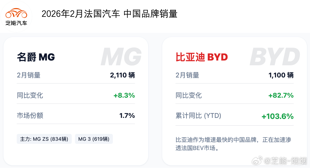 中国品牌表现亮眼,比亚迪与名爵均实现稳健增长,在法国市场的存在感持续提升。