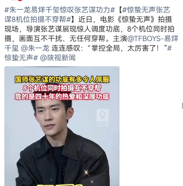 原来电影《惊蛰无声》拍摄现场,老谋子上演了一场教科书级的拍摄调度,8个机位同时开拍,各机位画面不仅互不干扰,更实现全程零穿帮,这般掌控力让主演朱一龙、易烊千玺连连感叹:“掌控全局,太厉害了!” 要知道,多机位同步拍摄本就考验导演的现场调度能力,机位数量越多,对画面构图、演员走位、场景布局的把控要求就越高,稍有不慎便会出现穿帮、画面重叠的问题。