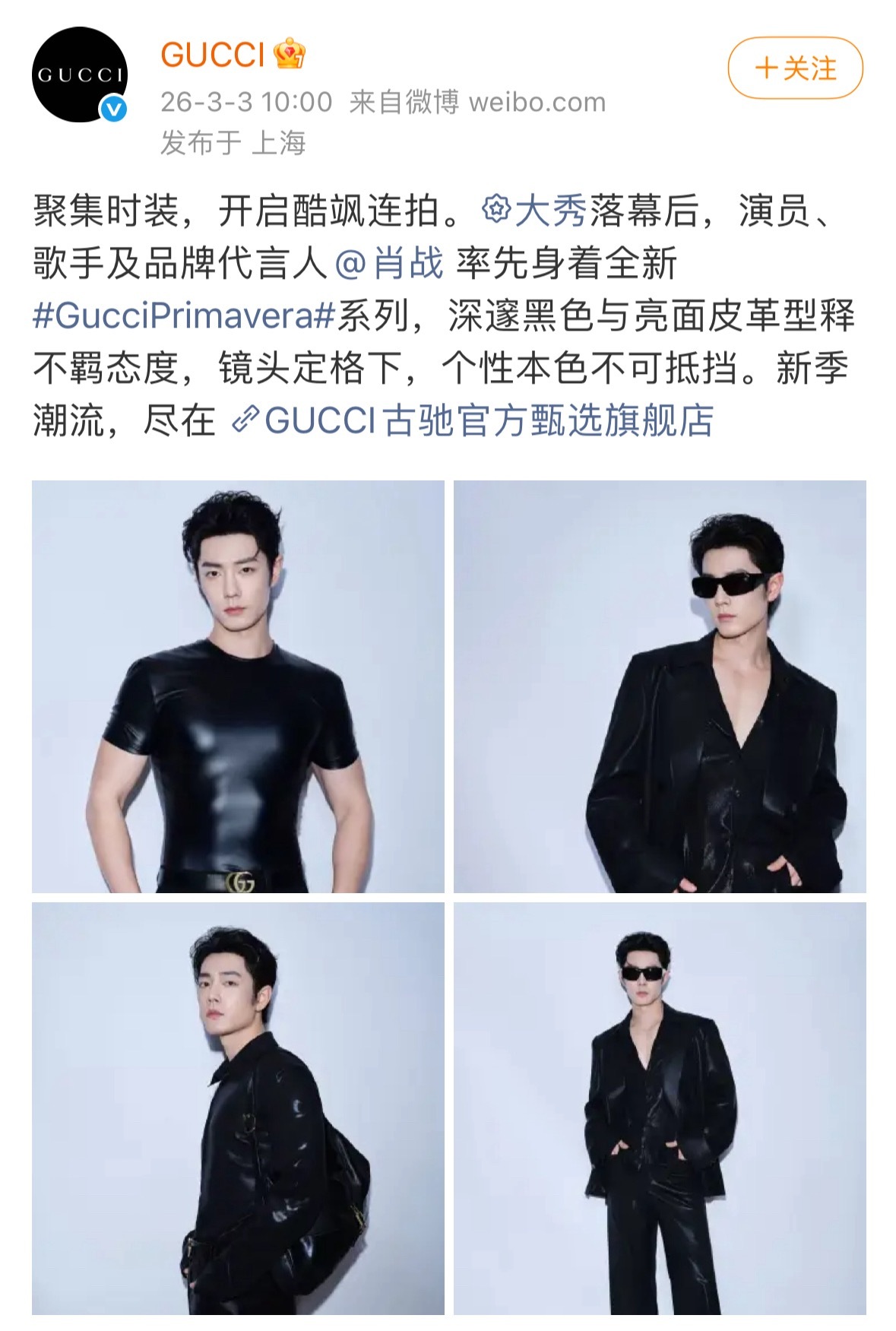 肖战第一个上身GucciPrimavera系列,allblack,斯哈~