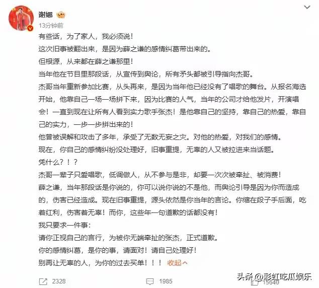 谢娜喊话薛之谦向张杰道歉,薛之谦当年在吐槽大会内涵张杰靠女友上位,导致张杰被骂了几年。 如今薛之谦被前女友手撕提到了张杰的歌很土,又提到了胡彦斌,谢娜不能忍了。 谢娜选择正面刚薛之谦,为家人出头她太帅了,这些年张杰被误解一声不吭,张杰的委屈谢娜都看在眼里。 时间能证明一切,张杰是凭实力说话,他没有靠女友上位,所以薛之谦欠张杰一个道歉!