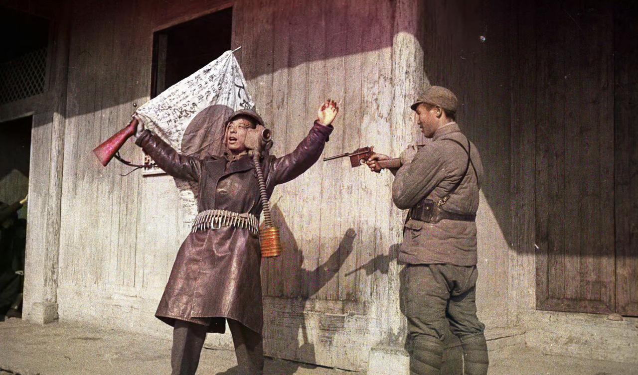 这张上色版的珍贵照片,源自美国著名战地摄影师哈里森·福尔曼(Harrison Forman)于1943年12月(圣诞节期间)在湖南常德会战结束后拍摄的黑白底片,是一组抗战纪实影像中的一张。 拍摄背景:1943年11月至12月,侵华日军发动常德会战,中国军队顽强抵抗并最终收复常德,此役被誉为“东方的斯大林格勒保卫战”。福尔曼作为《纽约时报》《美国国家地理》记者,深入战区记录了战后场景。 画面真相:这并非真实的俘虏场景,而是摆拍重演——左侧“日军士兵”是随行的西方战地记者,他穿上缴获的日军军装(皮大衣、头盔、防毒面具、弹药带),手持一面写满签名与祈愿文字的日军“千人针”军旗,夸张地举起双手;右侧是真实的中国士兵,手持驳壳枪(盒子炮)配合摆拍,模拟“活捉日军”的戏剧化场面。 史料价值:照片直观展现了中国军队的胜利姿态与缴获的日军装备,同时也反映了战时新闻报道中为增强视觉冲击力而进行的场景重演,是研究抗战时期中外记者报道方式的重要素材。 福尔曼的这批常德会战照片,现藏于美国威斯康星大学密尔沃基分校图书馆,原始档案标题明确标注为“一名战地记者伪装成投降的日军士兵”(a war correspondent pretends to be a surrendering Japanese soldier),清晰揭示了其摆拍属性。