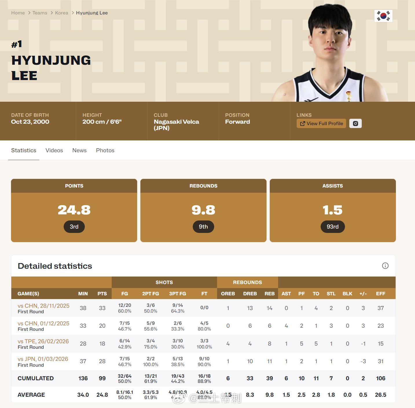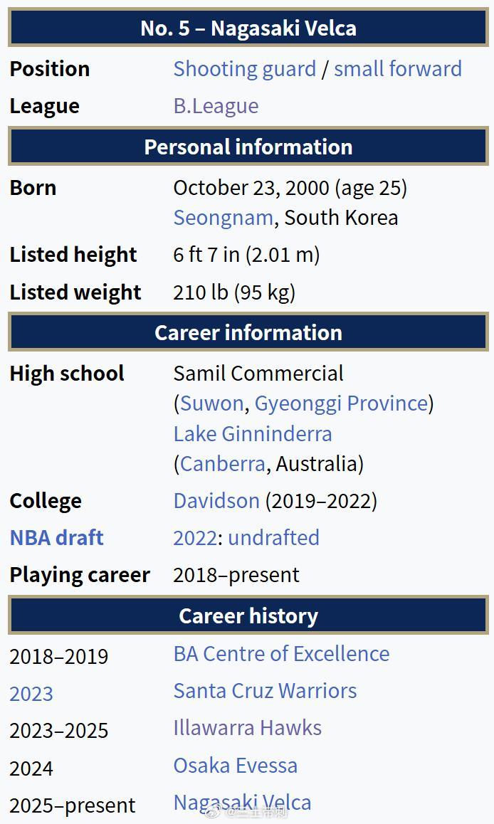 他目前的职业生涯经历,全是海外,澳洲两年打底,韩国给的少去了日本。目前他打亚洲级别的比赛,超纲的存在。