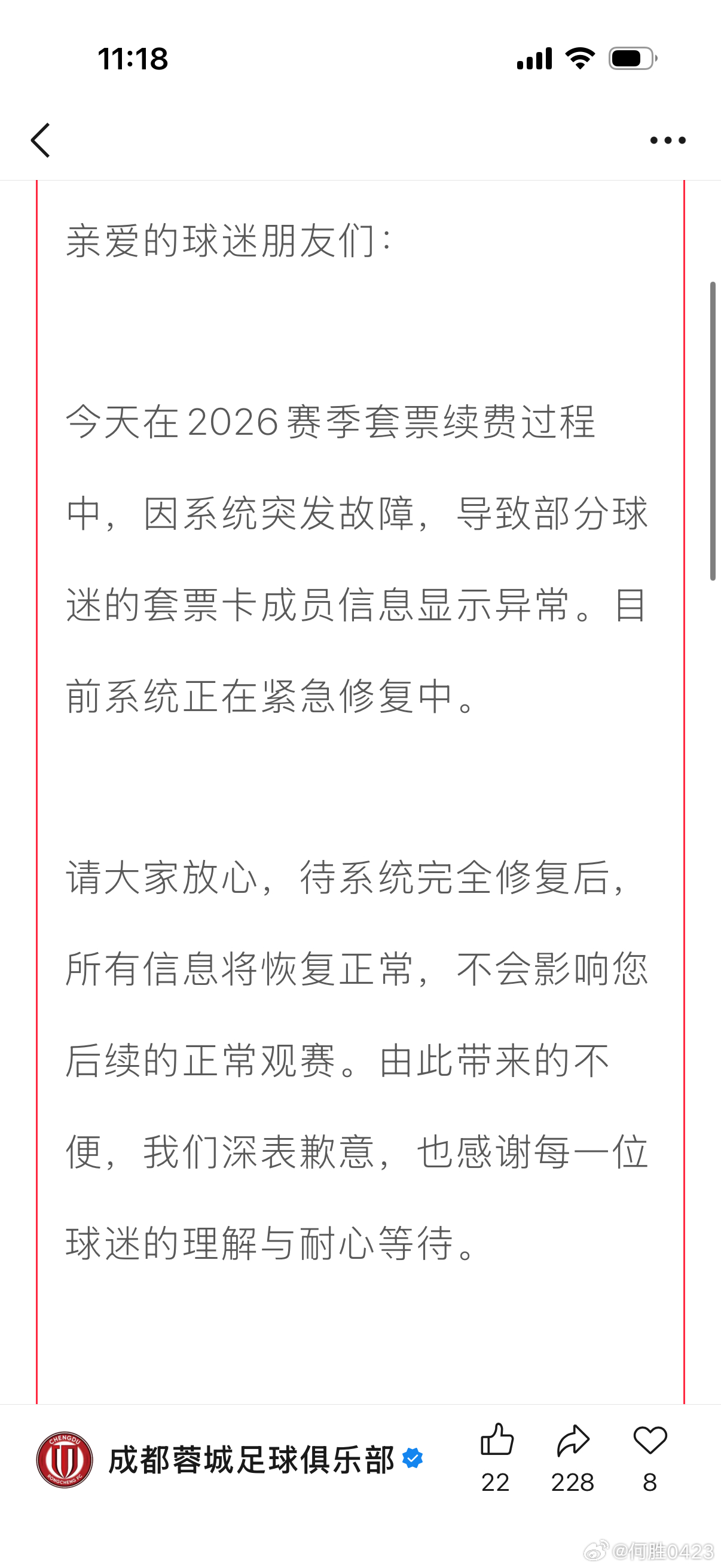经常有球迷问,为啥我总能抢到成都蓉城的球票,每场比赛还能坐那么好的位置,不为啥啊