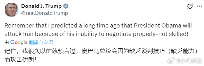 有网民翻出特朗普13年前批评时任总统奥巴马的帖文:“记住,我很久以前就预言过,奥巴马总统会因为缺乏谈判技巧(缺乏能力)而攻击伊朗!”美国驻沙特大使馆遭袭起火伊朗发起第13轮攻击黄媒不会说的真相